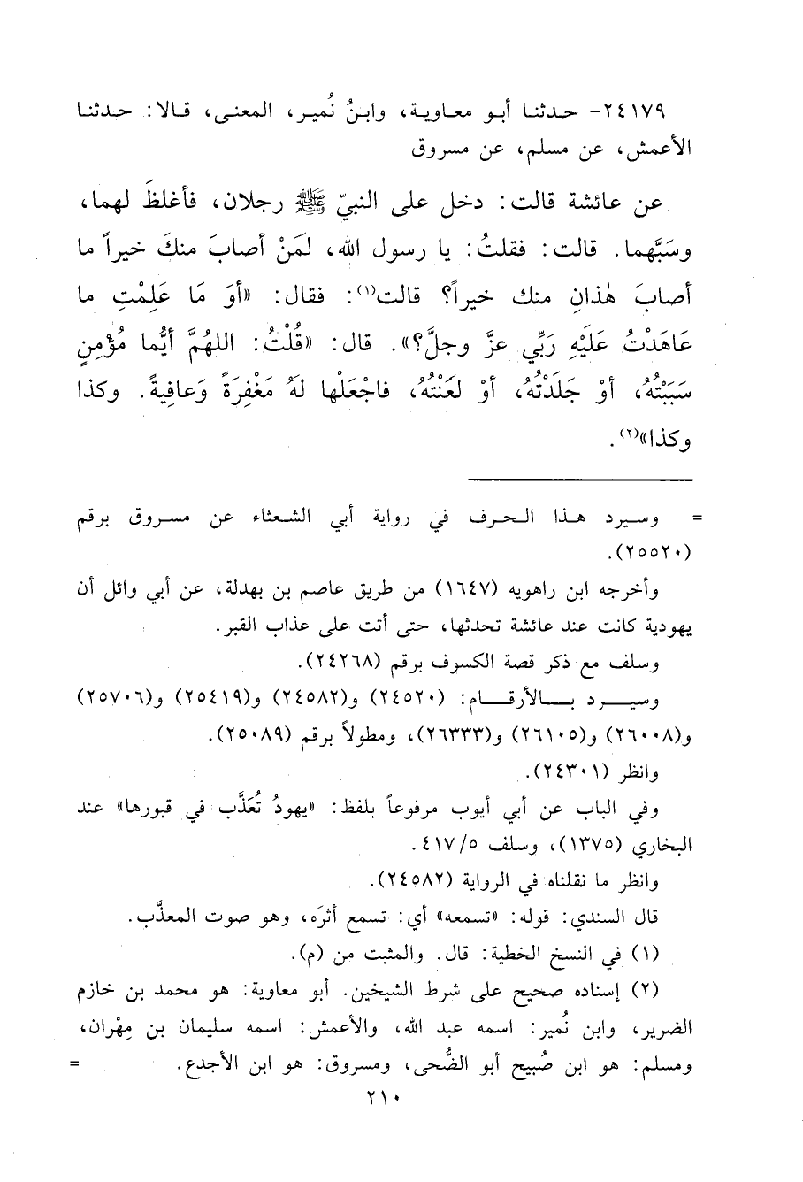 ٢٤١٧٩ - حَدَّثَنَا أَبُو مُعَاوِيَةَ، وَابْنُ نُمَيْرٍ الْمَعْنَى، قَالَا: حَدَّثَنَا الْأَعْمَشُ، عَنْ مُسْلِمٍ، عَنْ مَسْرُوقٍ، عَنْ عَائِشَةَ قَالَتْ: دَخَلَ عَلَى النَّبِيِّ صَلَّى اللهُ عَلَيْهِ وَسَلَّمَ رَجُلَانِ، فَأَغْلَظَ لَهُمَا وَسَبَّهُمَا. قَالَتْ: فَقُلْتُ: يَا رَسُولَ اللهِ، لَمَنْ أَصَابَ مِنْكَ خَيْرًا، مَا أَصَابَ هَذَانِ مِنْكَ خَيْرًا؟ قَالَتْ (١) : فَقَالَ: " أَوَمَا عَلِمْتِ مَا عَاهَدْتُ عَلَيْهِ رَبِّي عَزَّ وَجَلَّ؟ " قَالَ: قُلْتُ: " اللهُمَّ أَيُّمَا مُؤْمِنٍ سَبَبْتُهُ، أَوْ جَلَدْتُهُ، أَوْ لَعَنْتُهُ فَاجْعَلْهَا لَهُ مَغْفِرَةً، وَعَافِيَةً، وَكَذَا وَكَذَا " (٢)