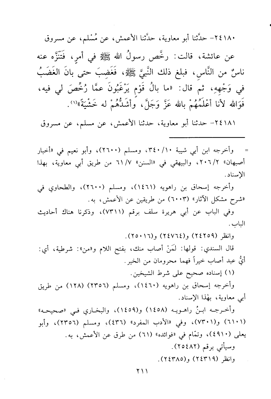 ٢٤١٨٠ - حَدَّثَنَا أَبُو مُعَاوِيَةَ، حَدَّثَنَا الْأَعْمَشُ، عَنْ مُسْلِمٍ، عَنْ مَسْرُوقٍ، عَنْ عَائِشَةَ قَالَتْ: رَخَّصَ رَسُولُ اللهِ صَلَّى اللهُ عَلَيْهِ وَسَلَّمَ فِي أَمْرٍ، فَتَنَزَّهَ عَنْهُ نَاسٌ مِنَ النَّاسِ، فَبَلَغَ ذَلِكَ النَّبِيَّ صَلَّى اللهُ عَلَيْهِ وَسَلَّمَ، فَغَضِبَ حَتَّى بَانَ الْغَضَبُ فِي وَجْهِهِ، ثُمَّ قَالَ: " مَا بَالُ قَوْمٍ يَرْغَبُونَ عَمَّا رُخِّصَ لِي فِيهِ، فَوَاللهِ لَأَنَا أَعْلَمُهُمْ بِاللهِ عَزَّ وَجَلَّ، وَأَشَدُّهُمْ لَهُ خَشْيَةً " (١)