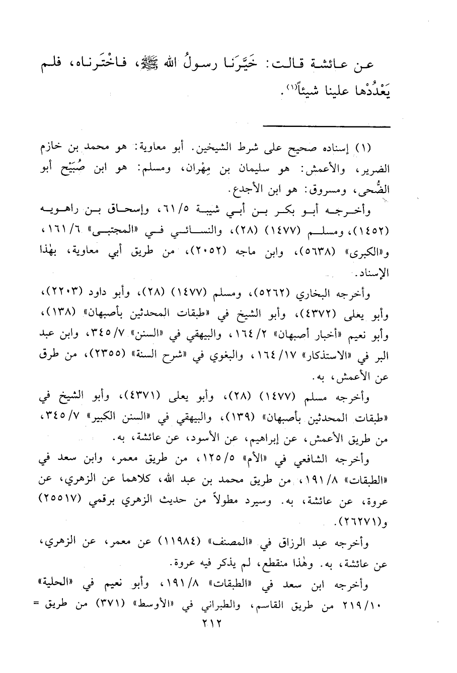 عَنْ عَائِشَةَ قَالَتْ: " خَيَّرَنَا رَسُولُ اللهِ صَلَّى اللهُ عَلَيْهِ وَسَلَّمَ، فَاخْتَرْنَاهُ، فَلَمْ يَعْدُدْهَا عَلَيْنَا شَيْئًا " (١)
