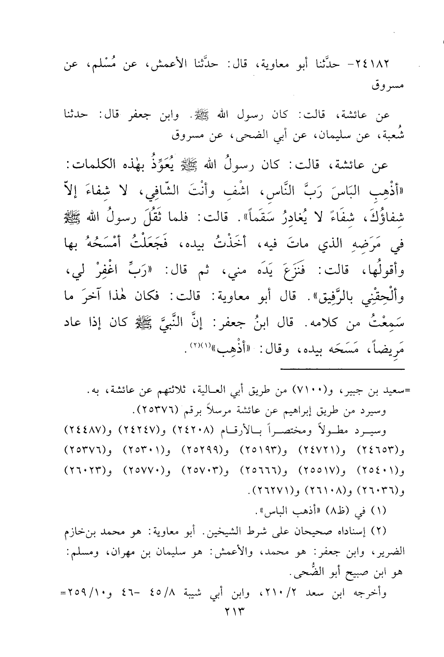 ٢٤١٨٢ - حَدَّثَنَا أَبُو مُعَاوِيَةَ قَالَ: حَدَّثَنَا الْأَعْمَشُ، عَنْ مُسْلِمٍ، عَنْ مَسْرُوقٍ، عَنْ عَائِشَةَ قَالَتْ: كَانَ رَسُولُ اللهِ صَلَّى اللهُ عَلَيْهِ وَسَلَّمَ، وَابْنُ جَعْفَرٍ قَالَ: حَدَّثَنَا شُعْبَةُ، عَنْ سُلَيْمَانَ، عَنْ أَبِي الضُّحَى، عَنْ مَسْرُوقٍ، عَنْ عَائِشَةَ قَالَتْ: كَانَ رَسُولُ اللهِ صَلَّى اللهُ عَلَيْهِ وَسَلَّمَ يُعَوِّذُ بِهَذِهِ الْكَلِمَاتِ: " أَذْهِبِ الْبَاسَ رَبَّ النَّاسِ، اشْفِ وَأَنْتَ الشَّافِي، لَا شِفَاءَ إِلَّا شِفَاؤُكَ، شِفَاءً لَا يُغَادِرُ سَقَمًا "