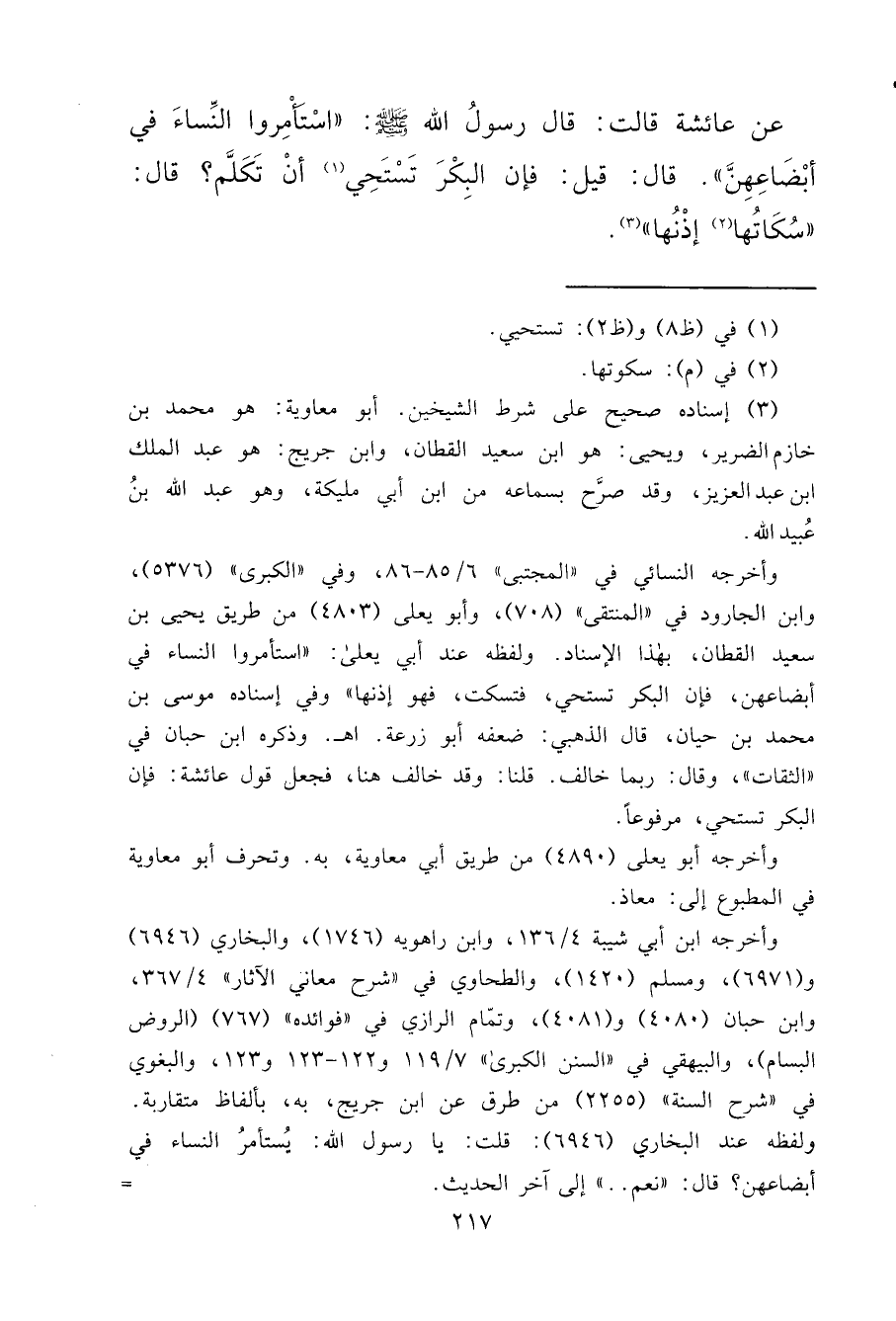 ولفظه عند البخاري (٦٩٤٦) : قلت: يا رسول الله: يُستأمرُ النساء في أوضاعهن؟ قال: "نعم.." إلى آخر الحديث. =