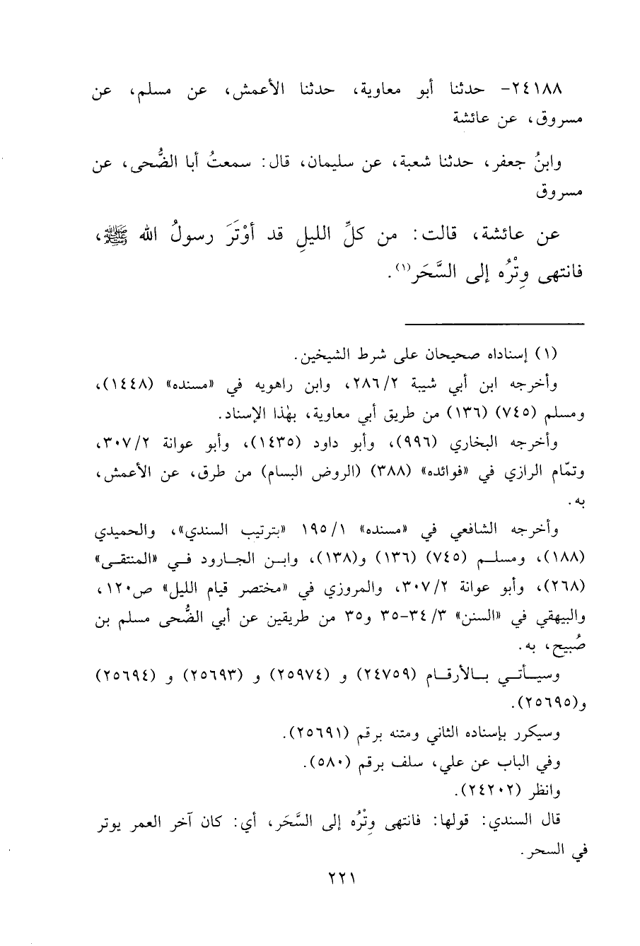 ٢٤١٨٨ - حَدَّثَنَا أَبُو مُعَاوِيَةَ، حَدَّثَنَا الْأَعْمَشُ، عَنْ مُسْلِمٍ، عَنْ مَسْرُوقٍ، عَنْ عَائِشَةَ، وَابْنُ جَعْفَرٍ، حَدَّثَنَا شُعْبَةُ، عَنْ سُلَيْمَانَ قَالَ: سَمِعْتُ أَبَا الضُّحَى، عَنْ مَسْرُوقٍ، عَنْ عَائِشَةَ قَالَتْ: " مِنْ كُلِّ اللَّيْلِ قَدْ أَوْتَرَ رَسُولُ اللهِ صَلَّى اللهُ عَلَيْهِ وَسَلَّمَ، فَانْتَهَى وِتْرُهُ إِلَى السَّحَرِ " (١)