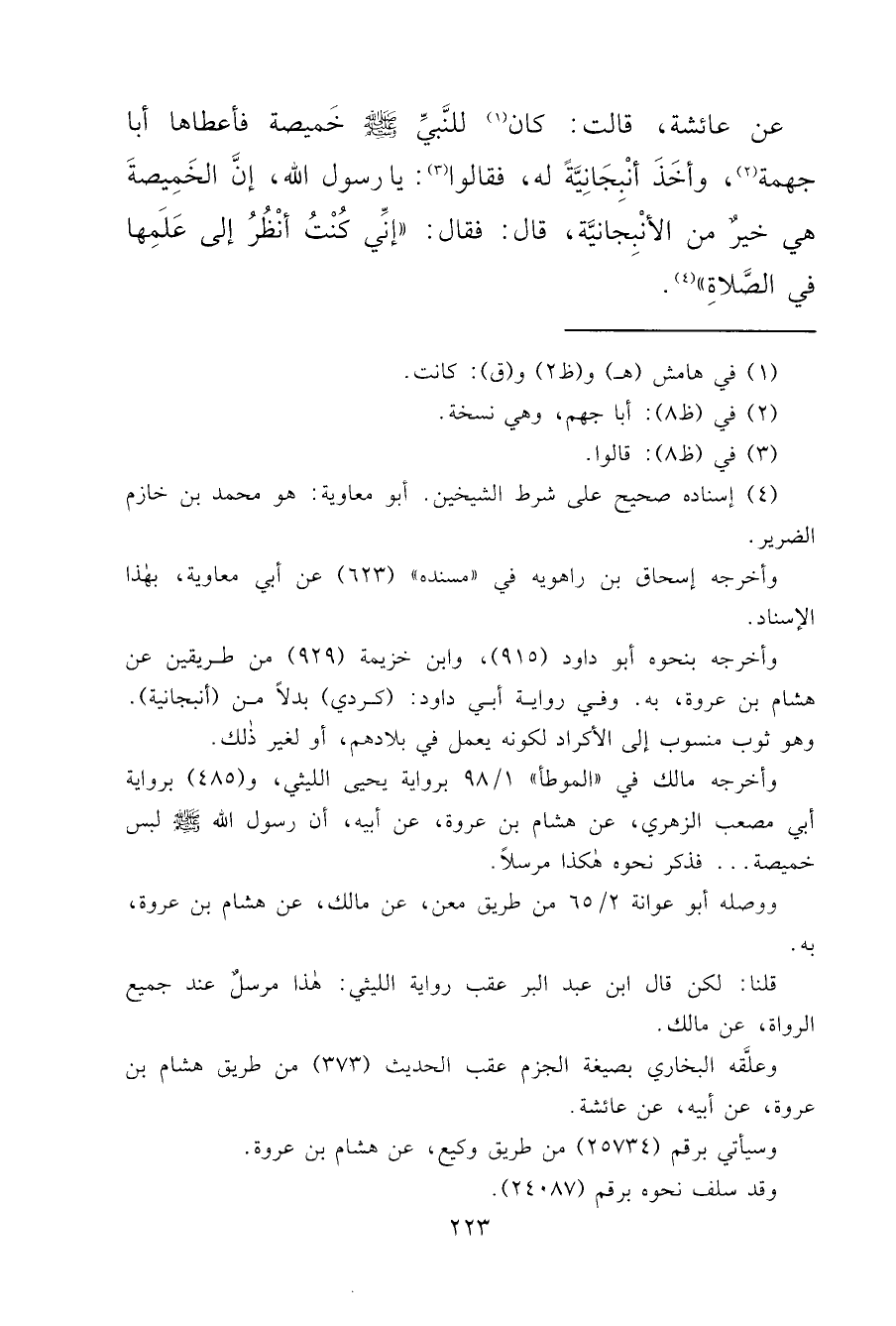 عَنْ عَائِشَةَ قَالَتْ: كَانَ (١) لِلنَّبِيِّ صَلَّى اللهُ عَلَيْهِ وَسَلَّمَ خَمِيصَةٌ، فَأَعْطَاهَا أَبَا جَهْمَةَ، (٢) وَأَخَذَ أَنْبِجَانِيَّةً لَهُ، فَقَالُوا: (٣) يَا رَسُولَ اللهِ، إِنَّ الْخَمِيصَةَ هِيَ خَيْرٌ مِنَ الْأَنْبِجَانِيَّةِ، قَالَ: فَقَالَ: " إِنِّي كُنْتُ أَنْظُرُ إِلَى عَلَمِهَا فِي الصَّلَاةِ " (٤)