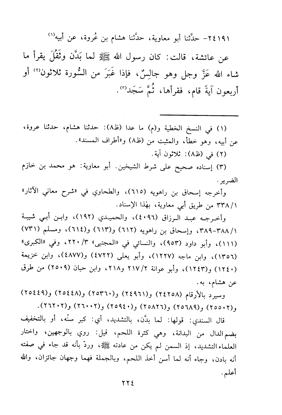 ٢٤١٩١ - حَدَّثَنَا أَبُو مُعَاوِيَةَ، حَدَّثَنَا هِشَامُ بْنُ عُرْوَةَ، عَنْ أَبِيهِ، (١) عَنْ عَائِشَةَ قَالَتْ: " كَانَ رَسُولُ اللهِ صَلَّى اللهُ عَلَيْهِ وَسَلَّمَ لَمَّا بَدَّنَ وَثَقُلَ يَقْرَأُ مَا شَاءَ اللهُ عَزَّ وَجَلَّ وَهُوَ جَالِسٌ، فَإِذَا غَبَرَ مِنَ السُّورَةِ ثَلَاثُونَ (٢) أَوْ أَرْبَعُونَ آيَةً، قَامَ فَقَرَأَهَا، ثُمَّ سَجَدَ " (٣)