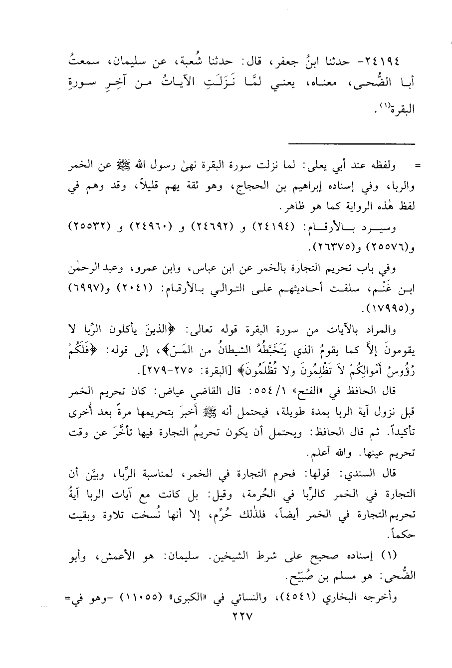 ٢٤١٩٤ - حَدَّثَنَا ابْنُ جَعْفَرٍ قَالَ: حَدَّثَنَا شُعْبَةُ، عَنْ سُلَيْمَانَ، سَمِعْتُ أَبَا الضُّحَى مَعْنَاهُ يَعْنِي لَمَّا نَزَلَتِ الْآيَاتُ مِنْ آخِرِ سُورَةِ الْبَقَرَةِ (١)