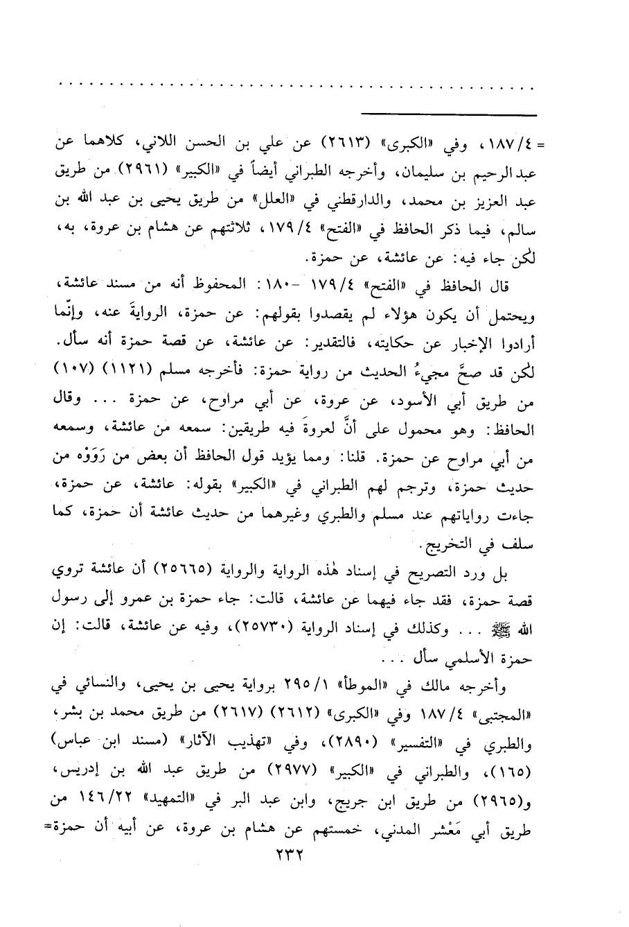 لكن قد صحَّ مجيءُ الحديث من رواية حمزة: فأخرجه مسلم (١١٢١) (١٠٧) من طريق أبي الأسود، عن عروة، عن أبي مراوح، عن حمزة ... وقال الحافظ: وهو محمول على أنَّ لعروةَ فيه طريقين: سمعه من عائشة، وسمعه من أبي مراوح عن حمزة. قلنا: ومما يؤيد قول الحافظ أن بعض من رَوَوْه من حديث حمزة، وترجم لهم الطبراني في "الكبير" بقوله: عائشة، عن حمزة، جاءت رواياتهم عند مسلم والطبري وغيرهما من حديث عائشة أن حمزة، كما سلف في التخريج.