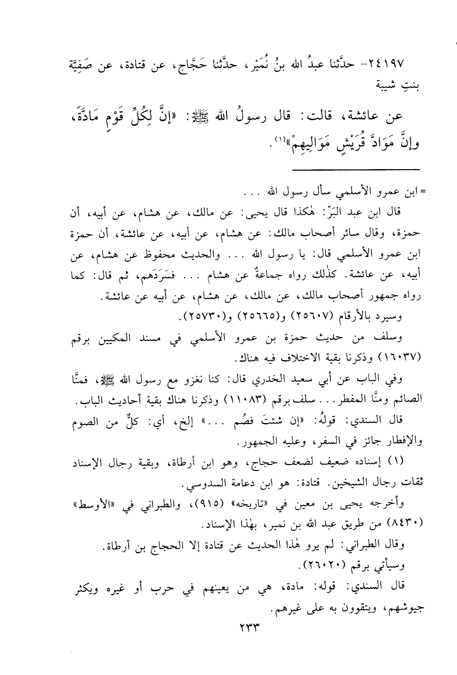 ٢٤١٩٧ - حَدَّثَنَا عَبْدُ اللهِ بْنُ نُمَيْرٍ، حَدَّثَنَا حَجَّاجٌ، عَنْ قَتَادَةَ، عَنْ صَفِيَّةَ بِنْتِ شَيْبَةَ، عَنْ عَائِشَةَ قَالَتْ: قَالَ رَسُولُ اللهِ صَلَّى اللهُ عَلَيْهِ وَسَلَّمَ: " إِنَّ لِكُلِّ قَوْمٍ مَادَّةً، وَإِنَّ مَوَادَّ قُرَيْشٍ مَوَالِيهِمْ " (١)