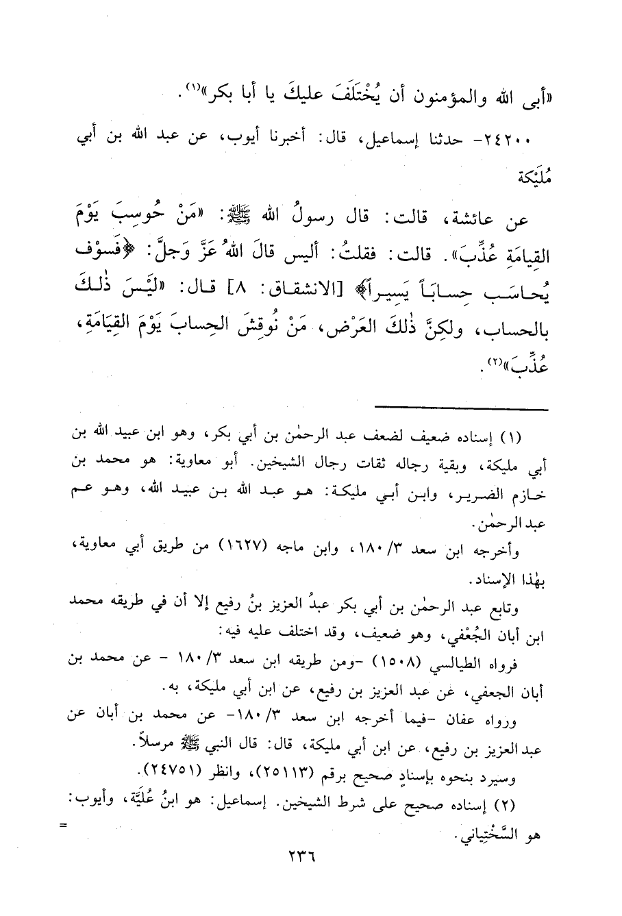 ٢٤٢٠٠ - حَدَّثَنَا إِسْمَاعِيلُ قَالَ: أَخْبَرَنَا أَيُّوبُ، عَنْ عَبْدِ اللهِ بْنِ أَبِي مُلَيْكَةَ، عَنْ عَائِشَةَ قَالَتْ: قَالَ رَسُولُ اللهِ صَلَّى اللهُ عَلَيْهِ وَسَلَّمَ: " مَنْ حُوسِبَ يَوْمَ الْقِيَامَةِ عُذِّبَ ". قَالَتْ: فَقُلْتُ: أَلَيْسَ قَالَ اللهُ عَزَّ وَجَلَّ: {فَسَوْفَ يُحَاسَبُ حِسَابًا يَسِيرًا} [الانشقاق: ٨] قَالَ: " لَيْسَ ذَلِكَ بِالْحِسَابِ، وَلَكِنَّ ذَلِكَ الْعَرْضُ مَنْ نُوقِشَ الْحِسَابَ يَوْمَ الْقِيَامَةِ، عُذِّبَ (٢)