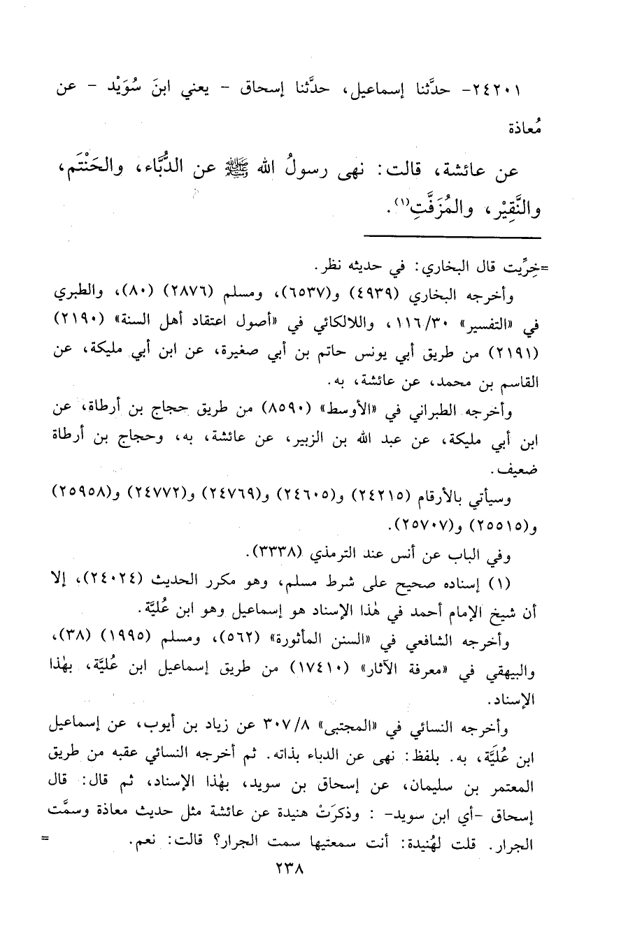 ٢٤٢٠١ - حَدَّثَنَا إِسْمَاعِيلُ، حَدَّثَنَا إِسْحَاقُ يَعْنِي ابْنَ سُوَيْدٍ، عَنْ مُعَاذَةَ، عَنْ عَائِشَةَ، قَالَتْ: " نَهَى رَسُولُ اللهِ صَلَّى اللهُ عَلَيْهِ وَسَلَّمَ عَنِ الدُّبَّاءِ، وَالْحَنْتَمِ، وَالنَّقِيرِ، وَالْمُزَفَّتِ " (١)