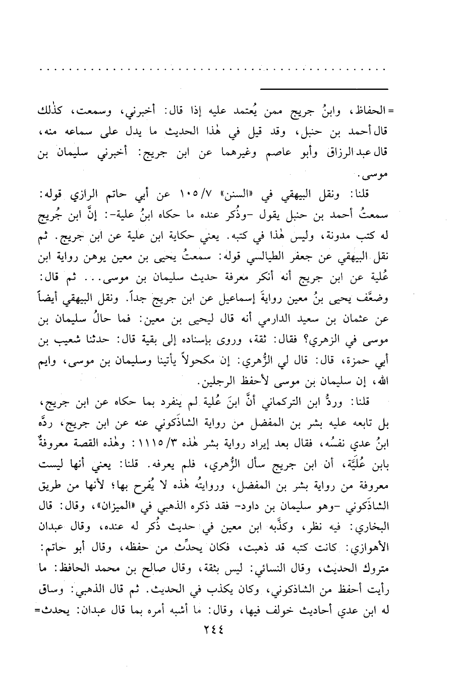 قلنا: ونقل البيهقي في "السنن" ٧/١٠٥ عن أبي حاتم الرازي قوله: سمعتُ أحمد بن حنبل يقول- وذُكر عنده ما حكاه ابنُ علية-: إنَّ ابن جريج له كتب مدونة، وليس هذا في كتبه. يعني حكاية ابن علية عن ابن جريج. ثم نقل البيهقي عن جعفر الطيالسي قوله: سمعتُ يحيى بن معين يوهن رواية ابن عُلية عن ابن جريج أنه أنكر معرفة حديث سليمان بن موسى ... ثم قال: وضعف يحيى بنُ معين روايةَ إسماعيل عن ابن جريج جداً. ونقل البيهقي أيضاً عن عثمان بن سعيد الدارمي انه قال ليحيى بن معين: فما حالُ سليمان بن موسى في الزهري؟ فقال: ثقة، وروى بإسناده إلى بقية قال: حدثنا شعيب بن أبي حمزة، قال: قال لي الزهري: إن مكحولاً يأتينا وسليمان بن موسى، وايم الله، إن سليمان بن موسى لأحفظ الرجلين.