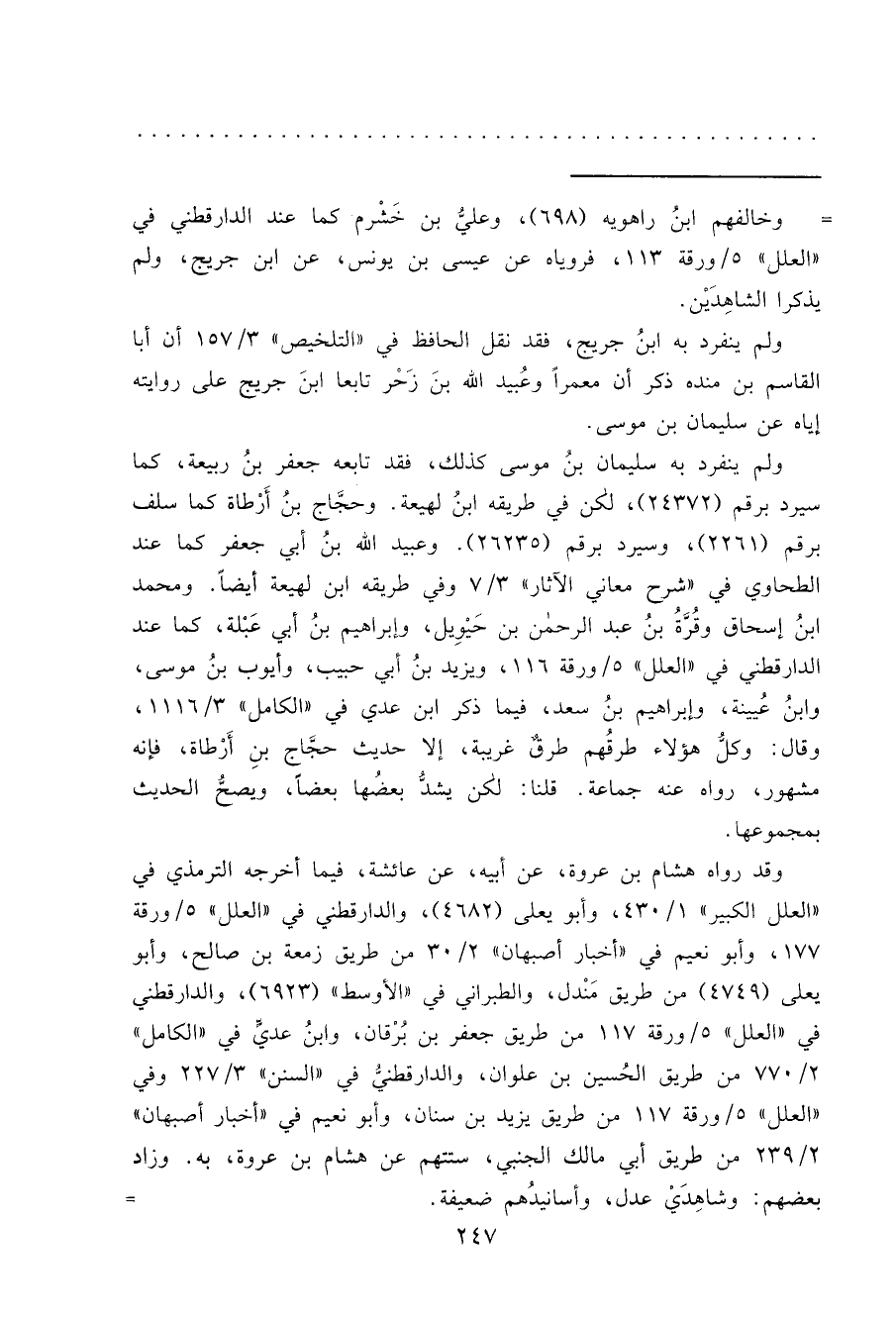 وخالفهم ابنُ راهوية (٦٩٨) ، وعليّ بن خَشْرم كما عند الدارقطني في "العلل" ٥/ورقة ١١٣، فروياه عن عيسى بن يونس، عن ابن جريج، وثم يذكرا الشاهِدَيْن.