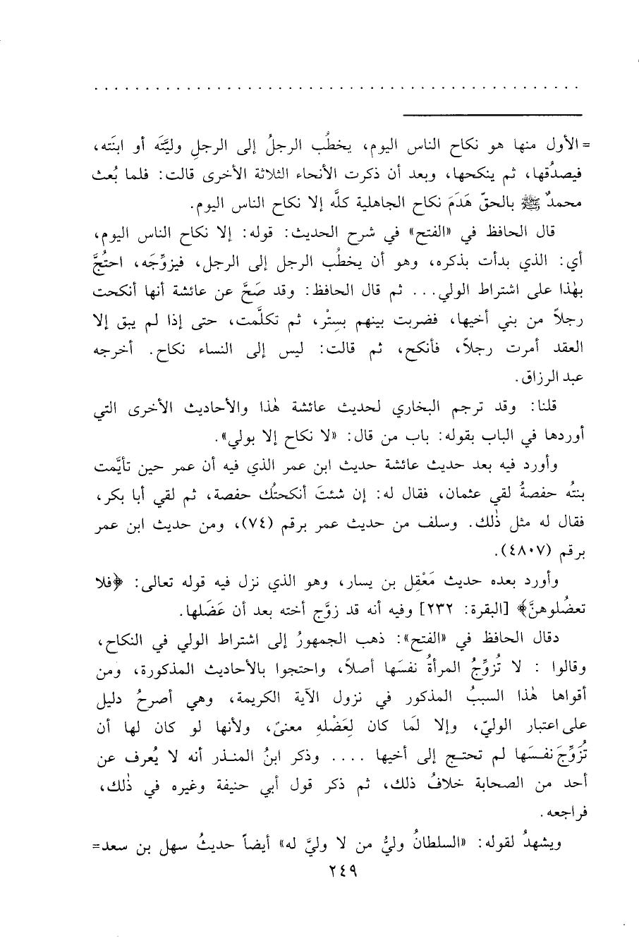 وقال الحافظ في "الفتح": ذهب الجمهورُ إلى اشتراط الولي في النكاح، وقالوا: لا تُزوِّجُ المرأةُ نفسَها أصلاً، واحتجوا بالأحاديث المذكورة، ومن أقواها هذا السببُ المذكور في نزول الآية الكريمة، وهي أصرحُ دليل على اعتبار الوليّ، وإلا لمَا كان لِعَضْلهِ معنيً، ولأنها لو كان لها أن تُزَوِّجَ نفسَها لم تفتح إلى أخيها.... وذكر ابنُ المنذر أنه لا يُعرف عن أحد من الصحابة خلافُ ذلك، ثم ذكر قول أبي حنيفة وغيره في ذلك، فراجعه.