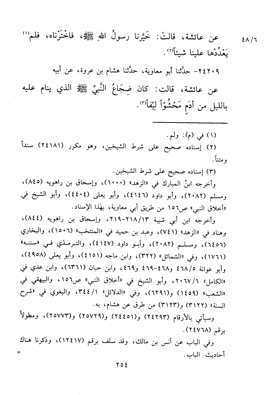 ٢٤٢٠٩ - حَدَّثَنَا أَبُو مُعَاوِيَةَ، حَدَّثَنَا هِشَامُ بْنُ عُرْوَةَ، عَنْ أَبِيهِ، عَنْ عَائِشَةَ قَالَتْ: كَانَ " ضِجَاعُ النَّبِيِّ صَلَّى اللهُ عَلَيْهِ وَسَلَّمَ الَّذِي يَنَامُ عَلَيْهِ بِاللَّيْلِ مِنْ أَدَمٍ مَحْشُوًّا لِيفًا " (٣)
