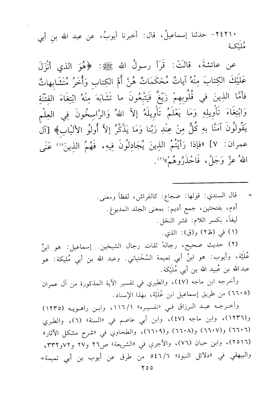 ٢٤٢١٠ - حَدَّثَنَا إِسْمَاعِيلُ قَالَ: أَخْبَرَنَا أَيُّوبُ، عَنْ عَبْدِ اللهِ بْنِ أَبِي مُلَيْكَةَ، عَنْ عَائِشَةَ قَالَتْ: قَرَأَ رَسُولُ اللهِ صَلَّى اللهُ عَلَيْهِ وَسَلَّمَ: {هُوَ الَّذِي أَنْزَلَ عَلَيْكَ الْكِتَابَ مِنْهُ آيَاتٌ مُحْكَمَاتٌ هُنَّ أُمُّ الْكِتَابِ وَأُخَرُ مُتَشَابِهَاتٌ فَأَمَّا الَّذِينَ فِي قُلُوبِهِمْ زَيْغٌ فَيَتَّبِعُونَ مَا تَشَابَهَ مِنْهُ ابْتِغَاءَ الْفِتْنَةِ وَابْتِغَاءَ تَأْوِيلِهِ وَمَا يَعْلَمُ تَأْوِيلَهُ إِلَّا اللهُ وَالرَّاسِخُونَ فِي الْعِلْمِ يَقُولُونَ آمَنَّا بِهِ كُلٌّ مِنْ عِنْدِ رَبِّنَا وَمَا يَذَّكَّرُ إِلَّا أُولُو الْأَلْبَابِ} " فَإِذَا رَأَيْتُمُ الَّذِينَ يُجَادِلُونَ فِيهِ، فَهُمُ الَّذِينَ (١) عَنَى الله عَزَّ وَجَلَّ، فَاحْذَرُوهُمْ " (٢)