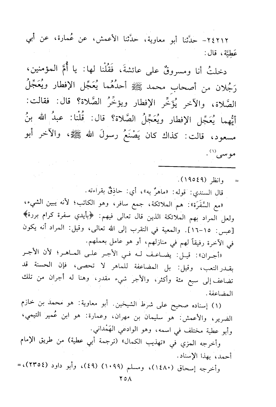 ٢٤٢١٢ - حَدَّثَنَا أَبُو مُعَاوِيَةَ، حَدَّثَنَا الْأَعْمَشُ، عَنْ عُمَارَةَ، عَنْ أَبِي عَطِيَّةَ قَالَ: دَخَلْتُ أَنَا ومَسْرُوقٌ، عَلَى عَائِشَةَ فَقُلْنَا لَهَا: يَا أُمَّ الْمُؤْمِنِينَ، رَجُلَانِ مِنْ أَصْحَابِ مُحَمَّدٍ صَلَّى اللهُ عَلَيْهِ وَسَلَّمَ، أَحَدُهُمَا يُعَجِّلُ الْإِفْطَارَ، وَيُعَجِّلُ الصَّلَاةَ، وَالْآخَرُ يُؤَخِّرُ الْإِفْطَارَ، وَيُؤَخِّرُ الصَّلَاةَ؟ قَالَ: فَقَالَتْ: أَيُّهُمَا يُعَجِّلُ الْإِفْطَارَ، وَيُعَجِّلُ الصَّلَاةَ؟ قَالَ: قُلْنَا: عَبْدُ اللهِ بْنُ مَسْعُودٍ: قَالَتْ: " كَذَاكَ كَانَ يَصْنَعُ رَسُولُ اللهِ صَلَّى اللهُ عَلَيْهِ وَسَلَّمَ "، وَالْآخَرُ أَبُو مُوسَى (١)