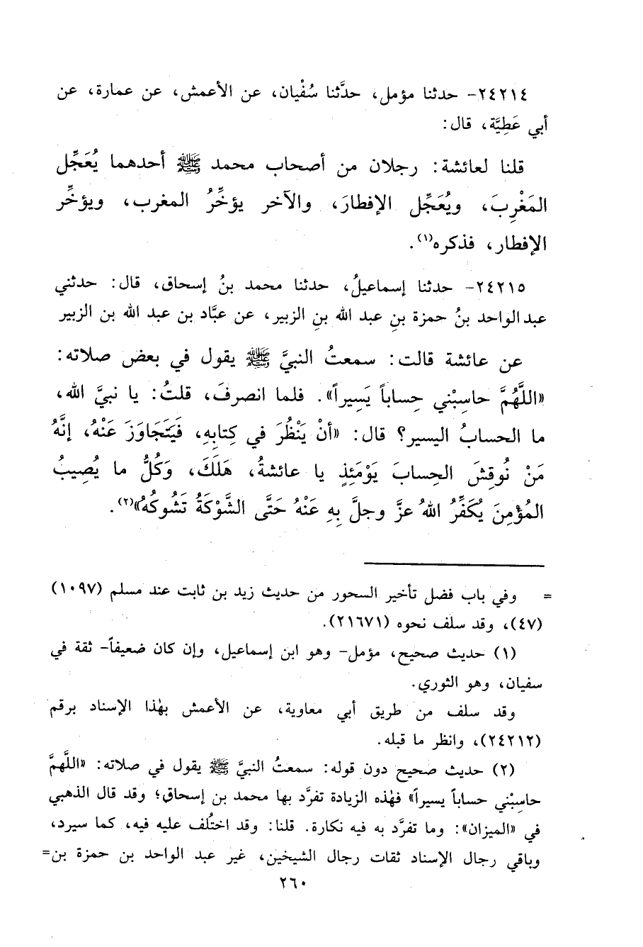 ٢٤٢١٥ - حَدَّثَنَا إِسْمَاعِيلُ، حَدَّثَنَا مُحَمَّدُ بْنُ إِسْحَاقَ قَالَ: حَدَّثَنِي عَبْدُ الْوَاحِدِ بْنُ حَمْزَةَ بْنِ عَبْدِ اللهِ بْنِ الزُّبَيْرِ، عَنْ عَبَّادِ بْنِ عَبْدِ اللهِ بْنِ الزُّبَيْرِ، عَنْ عَائِشَةَ قَالَتْ: سَمِعْتُ النَّبِيَّ صَلَّى اللهُ عَلَيْهِ وَسَلَّمَ يَقُولُ فِي بَعْضِ صَلَاتِهِ: " اللهُمَّ حَاسِبْنِي حِسَابًا يَسِيرًا " فَلَمَّا انْصَرَفَ، قُلْتُ: يَا نَبِيَّ اللهِ، مَا الْحِسَابُ الْيَسِيرُ؟ قَالَ: " أَنْ يَنْظُرَ فِي كِتَابِهِ فَيَتَجَاوَزَ عَنْهُ، إِنَّهُ مَنْ نُوقِشَ الْحِسَابَ يَوْمَئِذٍ يَا عَائِشَةُ هَلَكَ، وَكُلُّ مَا يُصِيبُ الْمُؤْمِنَ، يُكَفِّرُ اللهُ عَزَّ وَجَلَّ بِهِ عَنْهُ، حَتَّى الشَّوْكَةُ تَشُوكُهُ " (٢)