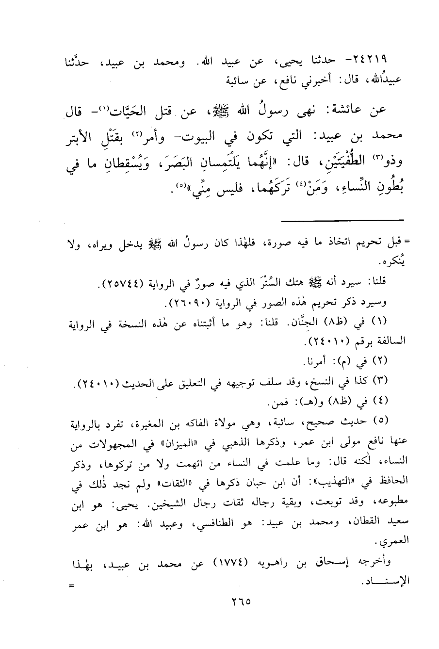 ٢٤٢١٩ - حَدَّثَنَا يَحْيَى، عَنْ عُبَيْدِ اللهِ، وَمُحَمَّدِ بْنِ عُبَيْدٍ، حَدَّثَنَا عُبَيْدُ اللهِ قَالَ: أَخْبَرَنِي نَافِعٌ، عَنْ سَائِبَةَ، عَنْ عَائِشَةَ، نَهَى رَسُولُ اللهِ صَلَّى اللهُ عَلَيْهِ وَسَلَّمَ عَنْ قَتْلِ الْحَيَّاتِ (١) ، قَالَ مُحَمَّدُ بْنُ عُبَيْدٍ: الَّتِي تَكُونُ فِي الْبُيُوتِ، وَأَمَرَنَا (٢) بِقَتْلِ الْأَبْتَرِ وذو (٣) الطُّفْيَتَيْنِ قَالَ: " إِنَّهُمَا يَلْتَمِسَانِ الْبَصَرَ، وَيُسْقِطَانِ مَا فِي بُطُونِ النِّسَاءِ، وَمَنْ (٤) تَرَكَهُمَا فَلَيْسَ مِنِّي " (٥)
