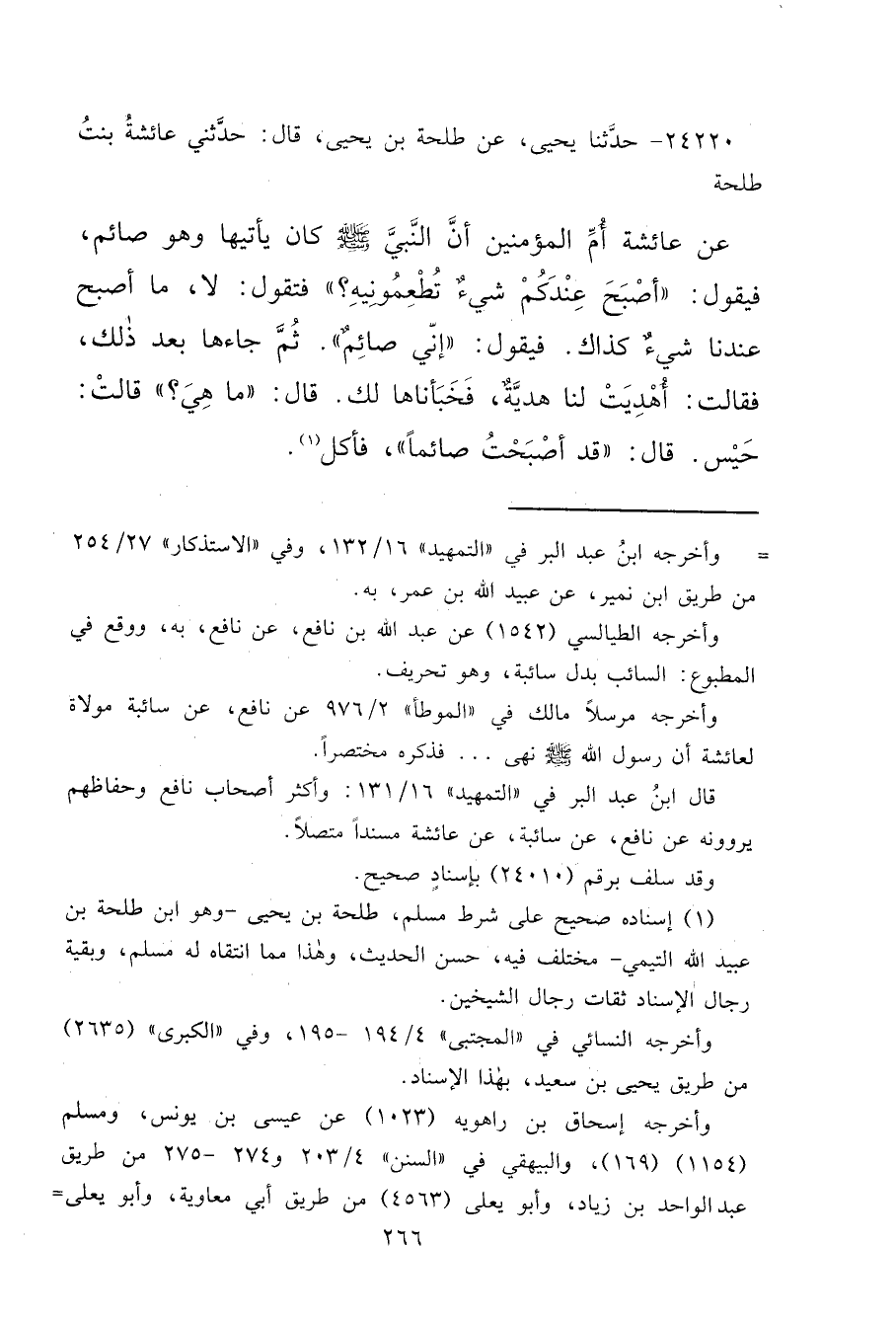 ٢٤٢٢٠ - حَدَّثَنَا يَحْيَى، عَنْ طَلْحَةَ بْنِ يَحْيَى قَالَ: حَدَّثَتْنِي عَائِشَةُ بِنْتُ طَلْحَةَ، عَنْ عَائِشَةَ أُمِّ الْمُؤْمِنِينَ، أَنَّ النَّبِيَّ صَلَّى اللهُ عَلَيْهِ وَسَلَّمَ كَانَ يَأْتِيهَا وَهُوَ صَائِمٌ فَيَقُولُ: " أَصْبَحَ عِنْدَكُمْ شَيْءٌ تُطْعِمُونِيهِ " فَتَقُولُ: لَا، مَا أَصْبَحَ عِنْدَنَا شَيْءٌ كَذَاكَ، فَيَقُولُ: " إِنِّي صَائِمٌ ". ثُمَّ جَاءَهَا بَعْدَ ذَلِكَ، فَقَالَتْ: أُهْدِيَتْ لَنَا هَدِيَّةٌ فَخَبَأْنَاهَا لَكَ، قَالَ: " مَا هِيَ؟ " قَالَتْ: " حَيْسٌ " قَالَ: " قَدْ أَصْبَحْتُ صَائِمًا " فَأَكَلَ (١)