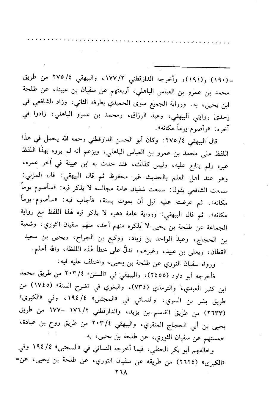 قال البيهقي ٤/٢٧٥: وكان أبو الحسن الدارقطني رحمه الله يحمل في هذا اللفظ على محمد بن عمرو بن العباس الباهلي، ويزعم أنه لم يروه بهذا اللفظ غيره ولم يتابع عليه، وليس كذلك، فقد حدث به ابن عيينة في آخر عمره، وهو عند أهل العلم بالحديث غير محفوظ ثم قال البيهقي: قال المزني: سمعت الشافعي يقوله: سمعت سفيان عامة مجالسه لا يذكر فيه: "سأصوم يوما مكانه". ثم عرضته عليه قبل أن يموت بسنة، فأجاب فيه: "سأصوم يومان مكانه". ثم قال البيهقي: ورواية عامة دهره لا يذكر فيه هذا اللفظ مع رواية الجماعة عن طلحة بن يحيى لا يذكره منهم أحد، منهم سفيان الثوري، وشعبة بن الحجاج، وعبد الواحد بن زياد، ووكيع بن الجراح، ويحيى بن سعيد القطان، ويعلى بن عبيد، وغيرهم، تدلُّ على خطا هذه اللفظة، والله أعلم.