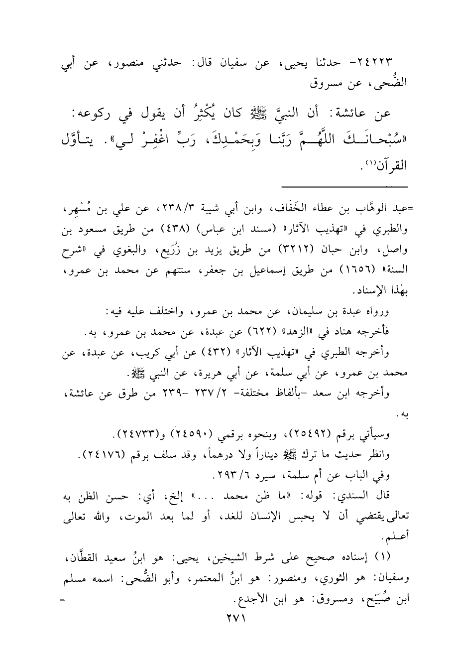 ٢٤٢٢٣ - حَدَّثَنَا يَحْيَى، عَنْ سُفْيَانَ قَالَ: حَدَّثَنِي مَنْصُورٌ، عَنْ أَبِي الضُّحَى، عَنْ مَسْرُوقٍ، عَنْ عَائِشَةَ، أَنَّ النَّبِيَّ صَلَّى اللهُ عَلَيْهِ وَسَلَّمَ كَانَ يُكْثِرُ أَنْ يَقُولَ فِي رُكُوعِهِ: " سُبْحَانَكَ اللهُمَّ رَبَّنَا، وَبِحَمْدِكَ رَبِّ اغْفِرْ لِي "، يَتَأَوَّلُ الْقُرْآنَ (١)