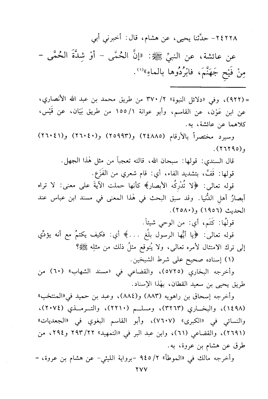 ٢٤٢٢٨ - حَدَّثَنَا يَحْيَى، عَنْ هِشَامٍ قَالَ: أَخْبَرَنِي أَبِي، عَنْ عَائِشَةَ، عَنِ النَّبِيِّ صَلَّى اللهُ عَلَيْهِ وَسَلَّمَ: " إِنَّ الْحُمَّى، أَوْ شِدَّةَ الْحُمَّى مِنْ فَيْحِ جَهَنَّمَ، فَأَبْرِدُوهَا بِالْمَاءِ " (١)