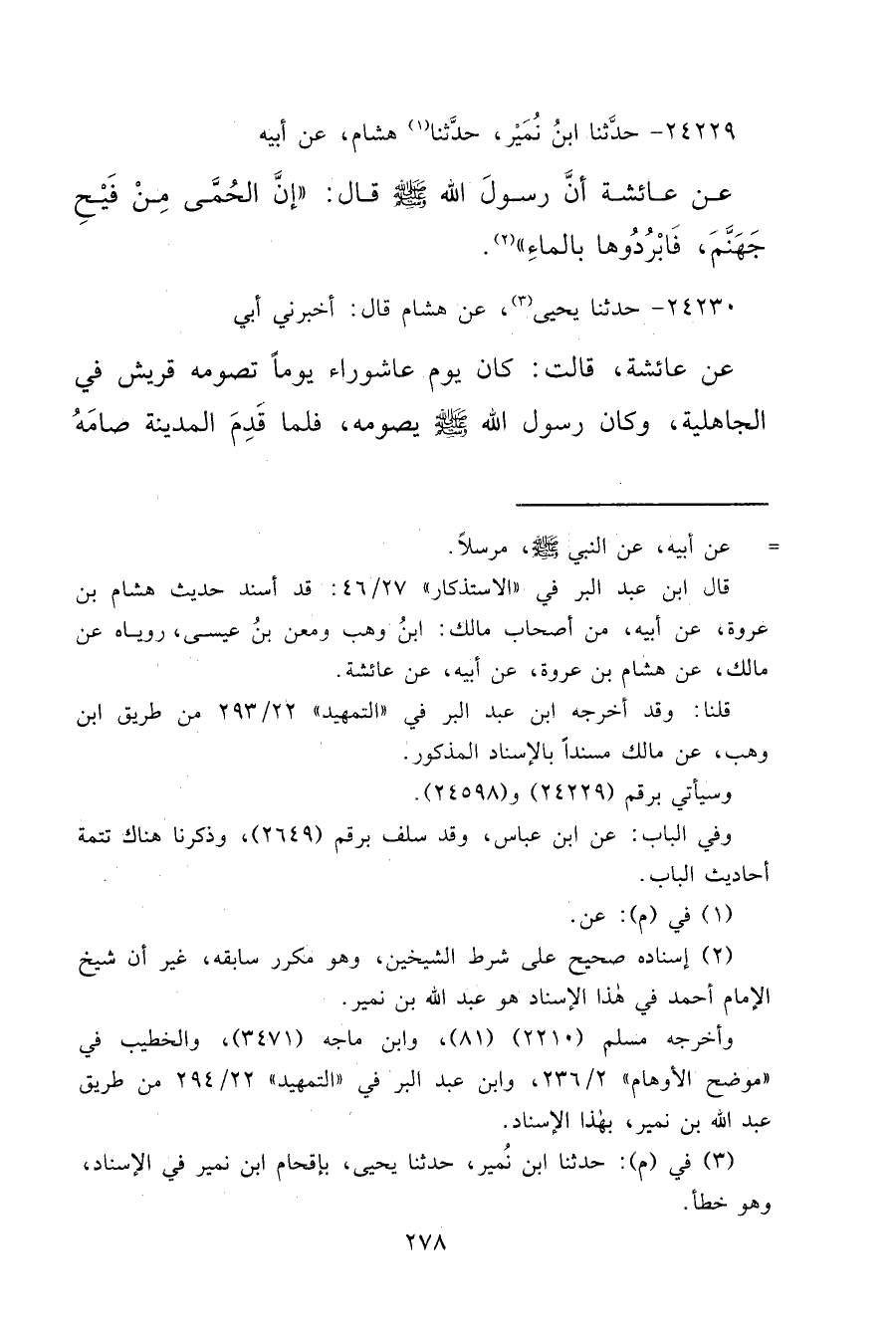 ٢٤٢٢٩ - حَدَّثَنَا ابْنُ نُمَيْرٍ، حَدَّثَنَا (١) هِشَامٍ، عَنْ أَبِيهِ، عَنْ عَائِشَةَ، أَنَّ رَسُولَ اللهِ صَلَّى اللهُ عَلَيْهِ وَسَلَّمَ قَالَ: " إِنَّ الْحُمَّى، مِنْ فَيْحِ جَهَنَّمَ، فَأَبْرِدُوهَا بِالْمَاءِ " (٢)