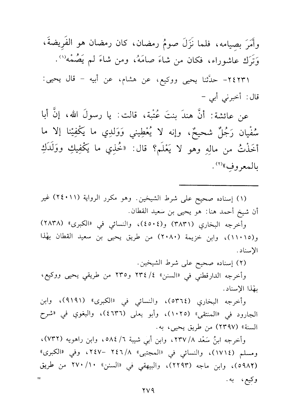 ٢٤٢٣١ - حَدَّثَنَا يَحْيَى، وَوَكِيعٌ، عَنْ هِشَامٍ، عَنْ أَبِيهِ، قَالَ: يَحْيَى قَالَ: أَخْبَرَنِي أَبِي، عَنْ عَائِشَةَ، أَنَّ هِنْدَ بِنْتَ عُتْبَةَ قَالَتْ: يَا رَسُولَ اللهِ، إِنَّ أَبَا سُفْيَانَ رَجُلٌ شَحِيحٌ، وَإِنَّهُ لَا يُعْطِينِي وَوَلَدِي مَا يَكْفِينَا، إِلَّا مَا أَخَذْتُ مِنْ مَالِهِ، وَهُوَ لَا يَعْلَمُ قَالَ: " خُذِي مَا يَكْفِيكِ وَوَلَدَكِ بِالْمَعْرُوفِ " (٢)