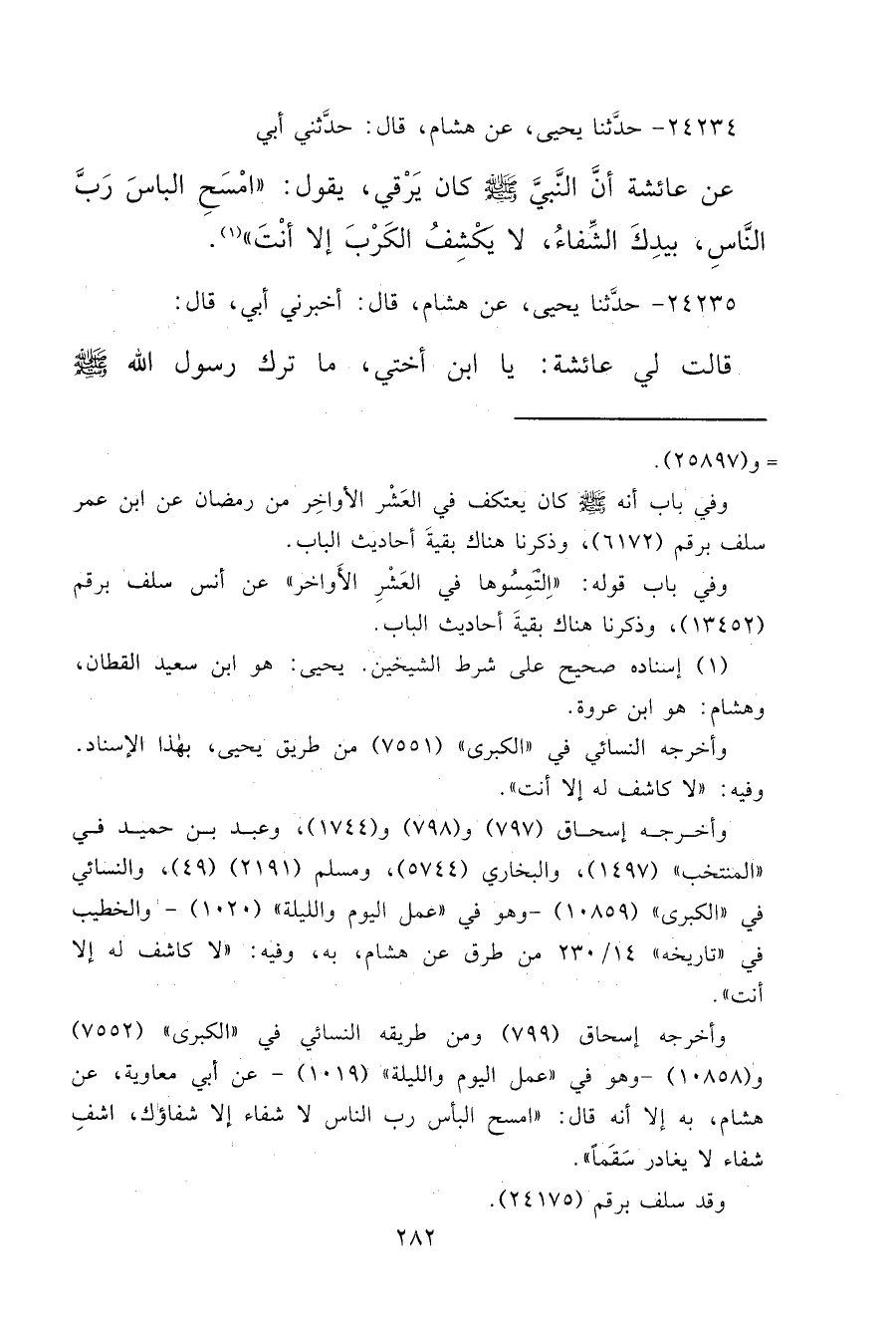 ٢٤٢٣٤ - حَدَّثَنَا يَحْيَى، عَنْ هِشَامٍ قَالَ: حَدَّثَنِي أَبِي، عَنْ عَائِشَةَ، أَنَّ النَّبِيَّ صَلَّى اللهُ عَلَيْهِ وَسَلَّمَ كَانَ يَرْقِي يَقُولُ: " امْسَحِ الْبَاسَ رَبَّ النَّاسِ، بِيَدِكَ الشِّفَاءُ، لَا يَكْشِفُ الْكَرْبَ إِلَّا أَنْتَ " (١)