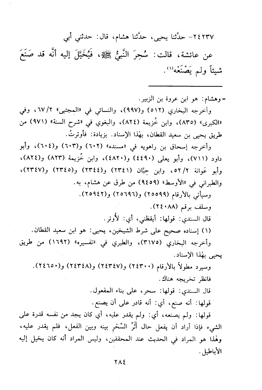 ٢٤٢٣٧ - حَدَّثَنَا يَحْيَى، حَدَّثَنَا هِشَامٌ قَالَ: حَدَّثَنِي أَبِي، عَنْ عَائِشَةَ قَالَتْ: " سُحِرَ النَّبِيُّ صَلَّى اللهُ عَلَيْهِ وَسَلَّمَ فَيُخَيَّلُ إِلَيْهِ، أَنَّهُ قَدْ صَنَعَ شَيْئًا، وَلَمْ يَصْنَعْهُ " (١)