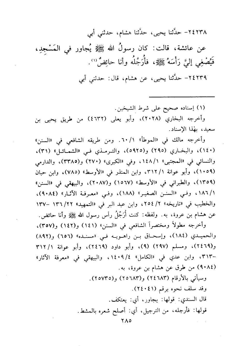 ٢٤٢٣٨ - حَدَّثَنَا يَحْيَى، حَدَّثَنَا هِشَامٌ، حَدَّثَنِي أَبِي، عَنْ عَائِشَةَ قَالَتْ: " كَانَ رَسُولُ اللهِ صَلَّى اللهُ عَلَيْهِ وَسَلَّمَ يُجَاوِرُ فِي الْمَسْجِدِ، فَيُصْغِي إِلَيَّ رَأْسَهُ صَلَّى اللهُ عَلَيْهِ وَسَلَّمَ فَأُرَجِّلُهُ، وَأَنَا حَائِضٌ " (١)