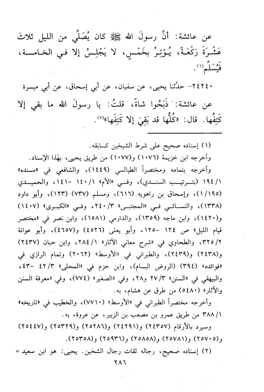 ٢٤٢٤٠ - حَدَّثَنَا يَحْيَى، عَنْ سُفْيَانَ، عَنْ أَبِي إِسْحَاقَ، عَنْ أَبِي مَيْسَرَةَ، عَنْ عَائِشَةَ، ذَبَحُوا شَاةً، قُلْتُ: يَا رَسُولَ اللهِ، مَا بَقِيَ إِلَّا كَتِفُهَا؟ قَالَ: " كُلُّهَا قَدْ بَقِيَ إِلَّا كَتِفَهَا " (٢)