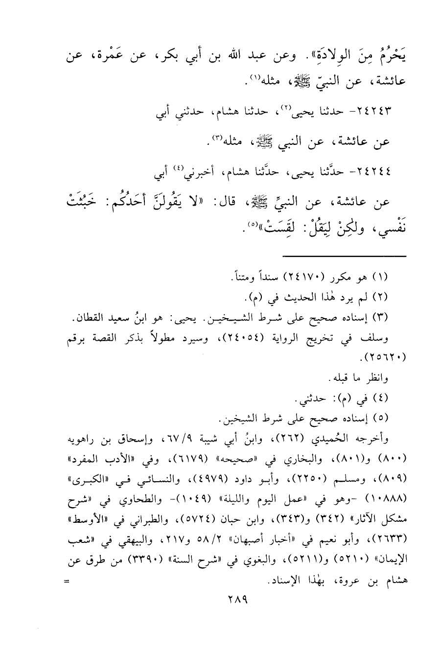 ٢٤٢٤٤ - حَدَّثَنَا يَحْيَى، حَدَّثَنَا هُشَامٌ، أَخْبَرَنِي (٤) أَبِي، عَنْ عَائِشَةَ، عَنِ النَّبِيِّ صَلَّى اللهُ عَلَيْهِ وَسَلَّمَ قَالَ: " لَا يَقُولَنَّ أَحَدُكُمْ خَبُثَتْ نَفْسِي، وَلَكِنْ لِيَقُلْ لَقِسَتْ " (٥)