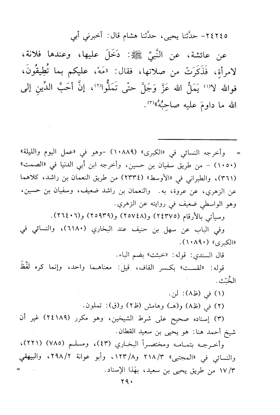 ٢٤٢٤٥ - حَدَّثَنَا يَحْيَى، حَدَّثَنَا هِشَامٌ قَالَ: أَخْبَرَنِي أَبِي، عَنْ عَائِشَةَ، عَنِ النَّبِيِّ صَلَّى اللهُ عَلَيْهِ وَسَلَّمَ، دَخَلَ عَلَيْهَا وَعِنْدَهَا فُلَانَةُ لِامْرَأَةٍ، فَذَكَرَتْ مِنْ صَلَاتِهَا، فَقَالَ: " مَهْ، عَلَيْكُمْ بِمَا تُطِيقُونَ، فَوَاللهِ لَا (١) يَمَلُّ اللهُ عَزَّ وَجَلَّ حَتَّى تَمَلُّوا (٢) ، إِنَّ أَحَبَّ الدِّينِ إِلَى اللهِ مَا دَاوَمَ عَلَيْهِ صَاحِبُهُ " (٣)