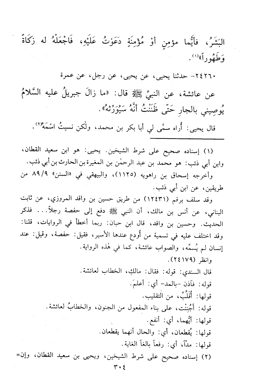 ٢٤٢٦٠ - حَدَّثَنَا يَحْيَى، عَنْ يَحْيَى، عَنْ رَجُلٍ، عَنْ عَمْرَةَ، عَنْ عَائِشَةَ، عَنِ النَّبِيِّ صَلَّى اللهُ عَلَيْهِ وَسَلَّمَ قَالَ: " مَا زَالَ جِبْرِيلُ عَلَيْهِ السَّلَامُ يُوصِينِي بِالْجَارِ، حَتَّى ظَنَنْتُ أَنَّهُ سَيُوَرِّثُهُ "، قَالَ يَحْيَى: " أُرَاهُ سَمَّى لِي أَبَا بَكْرِ بْنَ مُحَمَّدٍ وَلَكِنْ نَسِيتُ اسْمَهُ " (٢)
