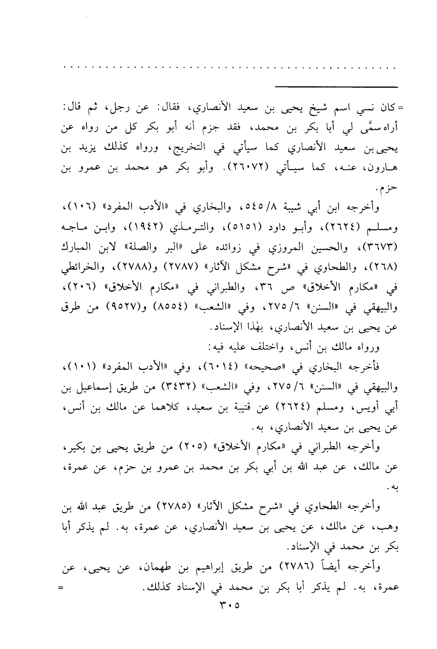 = كان نسي اسم شيخ يحيى بن سعيد الأنصاري، فقال: عن رجل، ثم قال: أراه سمَّى لي أبا بكر بن محمد، فقد جزم أنه أبو بكر كل من رواه عن يحيى بن سعيد الأنصاري كما سيأتي في التخريج، ورواه كذلك يزيد بن هارون، عنه، كما سيأتي (٢٦٠٧٢) . وأبو بكر هو محمد بن عمرو بن حزم.