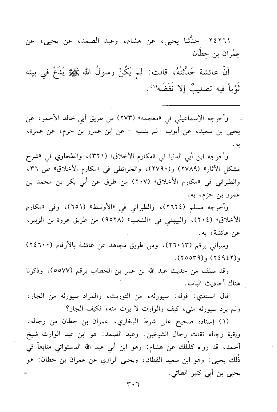 ٢٤٢٦١ - حَدَّثَنَا يَحْيَى، عَنْ هِشَامٍ، وَعَبْدُ الصَّمَدِ، عَنْ يَحْيَى، عَنْ عِمْرَانَ بْنِ حِطَّانَ، أَنَّ عَائِشَةَ حَدَّثَتْهُ، قَالَتْ: " لَمْ يَكُنْ رَسُولُ اللهِ صَلَّى اللهُ عَلَيْهِ وَسَلَّمَ يَدَعُ فِي بَيْتِهِ ثَوْبًا فِيهِ تَصْلِيبٌ، إِلَّا نَقَضَهُ " (١)