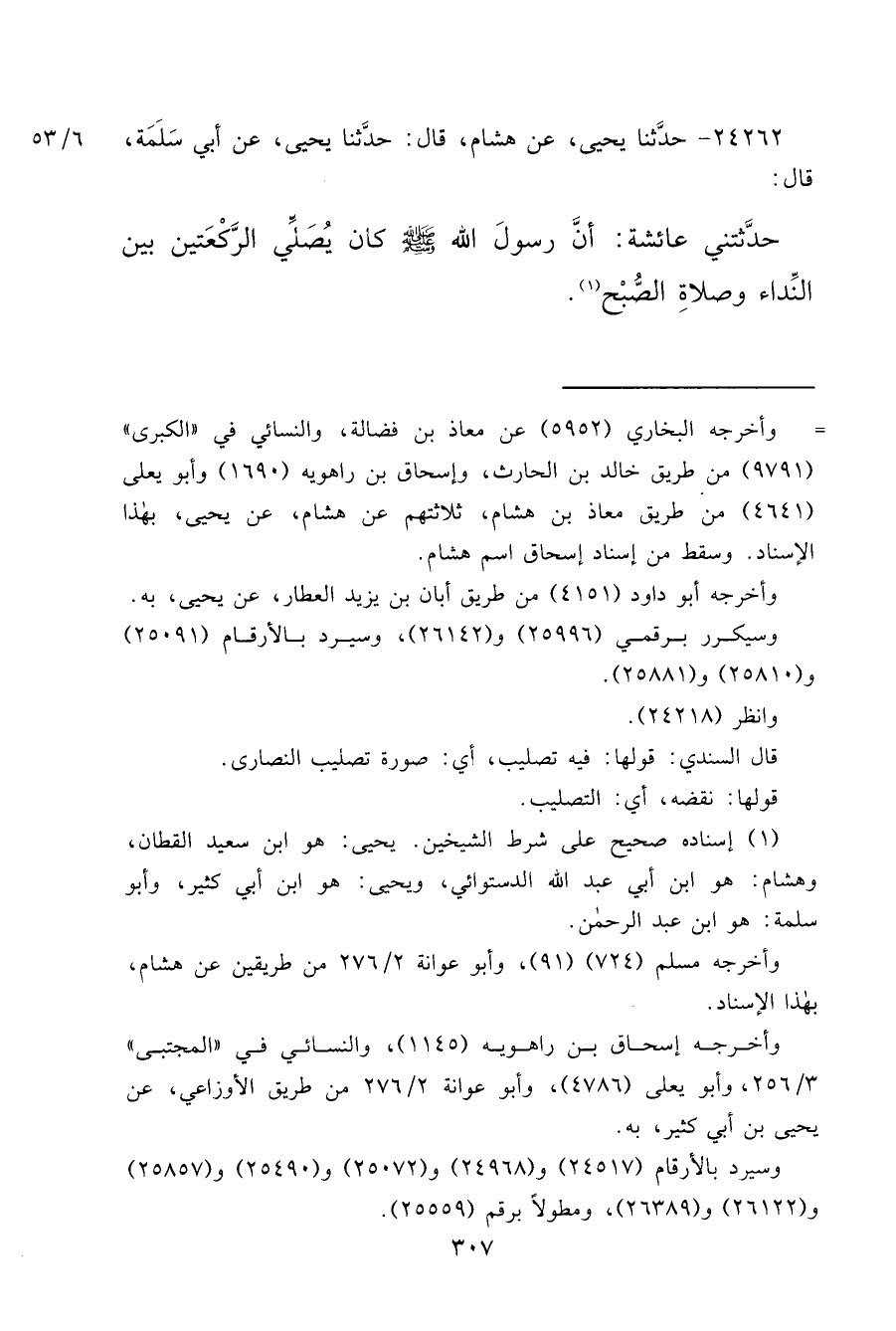 ٢٤٢٦٢ - حَدَّثَنَا يَحْيَى، عَنْ هِشَامٍ قَالَ: حَدَّثَنَا يَحْيَى، عَنْ أَبِي سَلَمَةَ قَالَ: حَدَّثَتْنِي عَائِشَةُ، " أَنَّ رَسُولَ اللهِ صَلَّى اللهُ عَلَيْهِ وَسَلَّمَ كَانَ يُصَلِّي الرَّكْعَتَيْنِ بَيْنَ النِّدَاءِ، وَصَلَاةِ الصُّبْحِ " (١)