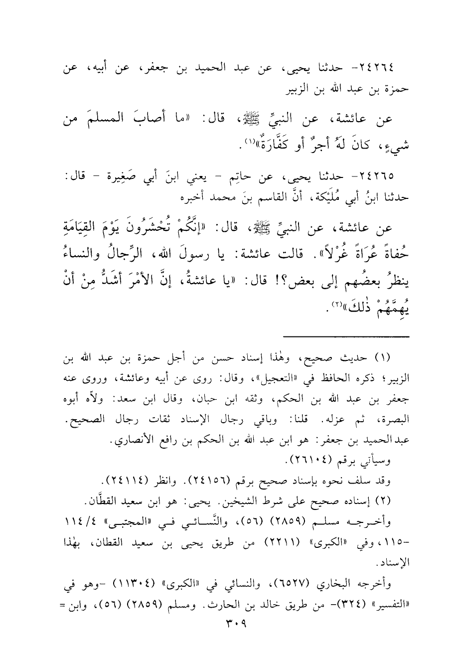 ٢٤٢٦٥ - حَدَّثَنَا يَحْيَى، عَنْ حَاتِمٍ يَعْنِي ابْنَ أَبِي صَغِيرَةَ قَالَ: حَدَّثَنَا ابْنُ أَبِي مُلَيْكَةَ، أَنَّ الْقَاسِمَ بْنَ مُحَمَّدٍ، أَخْبَرَهُ، عَنْ عَائِشَةَ، عَنِ النَّبِيِّ صَلَّى اللهُ عَلَيْهِ وَسَلَّمَ قَالَ: " إِنَّكُمْ تُحْشَرُونَ يَوْمَ الْقِيَامَةِ، حُفَاةً، عُرَاةً، غُرْلًا " قَالَتْ عَائِشَةُ: يَا رَسُولَ اللهِ، الرِّجَالُ وَالنِّسَاءُ يَنْظُرُ بَعْضُهُمْ إِلَى بَعْضٍ؟ قَالَ: " يَا عَائِشَةُ، إِنَّ الْأَمْرَ أَشَدُّ مِنْ أَنْ يُهِمَّهُمْ ذَلِكَ " (٢)
