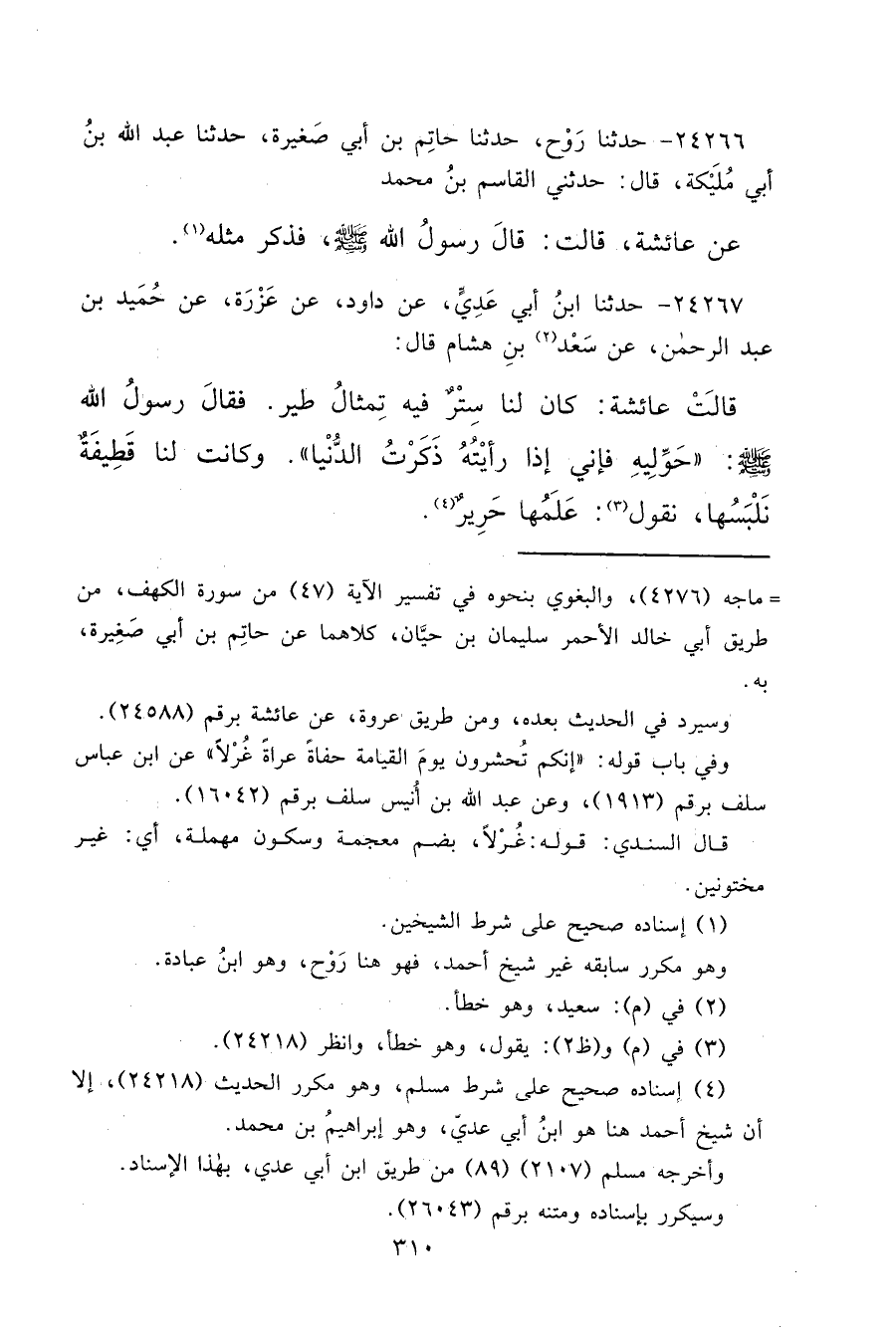 ٢٤٢٦٦ - حَدَّثَنَا رَوْحٌ، حَدَّثَنَا حَاتِمُ بْنُ أَبِي صَغِيرَةَ، حَدَّثَنَا عَبْدُ اللهِ بْنُ أَبِي مُلَيْكَةَ قَالَ: حَدَّثَنِي الْقَاسِمُ بْنُ مُحَمَّدٍ، عَنْ عَائِشَةَ قَالَتْ: قَالَ رَسُولُ اللهِ صَلَّى اللهُ عَلَيْهِ وَسَلَّمَ: فَذَكَرَ مِثْلَهُ (١)
