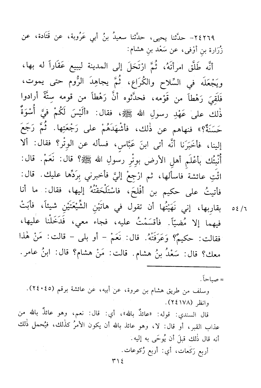 ٢٤٢٦٩ - حَدَّثَنَا يَحْيَى، حَدَّثَنَا سَعِيدُ بْنُ أَبِي عَرُوبَةَ، عَنْ قَتَادَةَ، عَنْ زُرَارَةَ بْنِ أَوْفَى، عَنْ سَعْدِ بْنِ هِشَامٍ، أَنَّهُ طَلَّقَ امْرَأَتَهُ، ثُمَّ ارْتَحَلَ إِلَى الْمَدِينَةِ لِيَبِيعَ عَقَارًا لَهُ بِهَا، وَيَجْعَلَهُ فِي السِّلَاحِ وَالْكُرَاعِ، ثُمَّ يُجَاهِدَ الرُّومَ حَتَّى يَمُوتَ، فَلَقِيَ رَهْطًا مِنْ قَوْمِهِ، فَحَدَّثُوهُ أَنَّ رَهْطًا مِنْ قَوْمِهِ سِتَّةً أَرَادُوا ذَلِكَ عَلَى عَهْدِ رَسُولِ اللهِ صَلَّى اللهُ عَلَيْهِ وَسَلَّمَ، فَقَالَ: " أَلَيْسَ لَكُمْ فِيَّ أُسْوَةٌ حَسَنَةٌ؟ " فَنَهَاهُمْ عَنْ ذَلِكَ، فَأَشْهَدَهُمْ عَلَى رَجْعَتِهَا، ثُمَّ رَجَعَ إِلَيْنَا، فَأَخْبَرَنَا أَنَّهُ أَتَى ابْنَ عَبَّاسٍ، فَسَأَلَهُ عَنِ الْوَتْرِ؟ فَقَالَ: أَلَا أُنَبِّئُكَ بِأَعْلَمِ أَهْلِ الْأَرْضِ، بِوَتْرِ رَسُولِ اللهِ صَلَّى اللهُ عَلَيْهِ وَسَلَّمَ؟ قَالَ: نَعَمْ، قَالَ: ائْتِ عَائِشَةَ فَاسْأَلْهَا؟ ثُمَّ ارْجِعْ إِلَيَّ، فَأَخْبِرْنِي بِرَدِّهَا عَلَيْكَ، قَالَ: فَأَتَيْتُ عَلَى حَكِيمِ بْنِ أَفْلَحَ فَاسْتَلْحَقْتُهُ إِلَيْهَا، فَقَالَ: مَا أَنَا بِقَارِبِهَا، إِنِّي نَهَيْتُهَا أَنْ تَقُولَ فِي هَاتَيْنِ الشِّيعَتَيْنِ شَيْئًا، فَأَبَتْ فِيهِمَا، إِلَّا مُضِيًّا، فَأَقْسَمْتُ عَلَيْهِ، فَجَاءَ مَعِي، فَدَخَلْنَا عَلَيْهَا، فَقَالَتْ: حَكِيمٌ؟ وَعَرَفَتْهُ، قَالَ: نَعَمْ، أَوْ بَلَى، قَالَتْ: مَنْ هَذَا مَعَكَ؟ قَالَ سَعْدُ بْنُ هِشَامٍ، قَالَتْ: مَنْ هِشَامٌ؟ قَالَ ابْنُ عَامِرٍ: