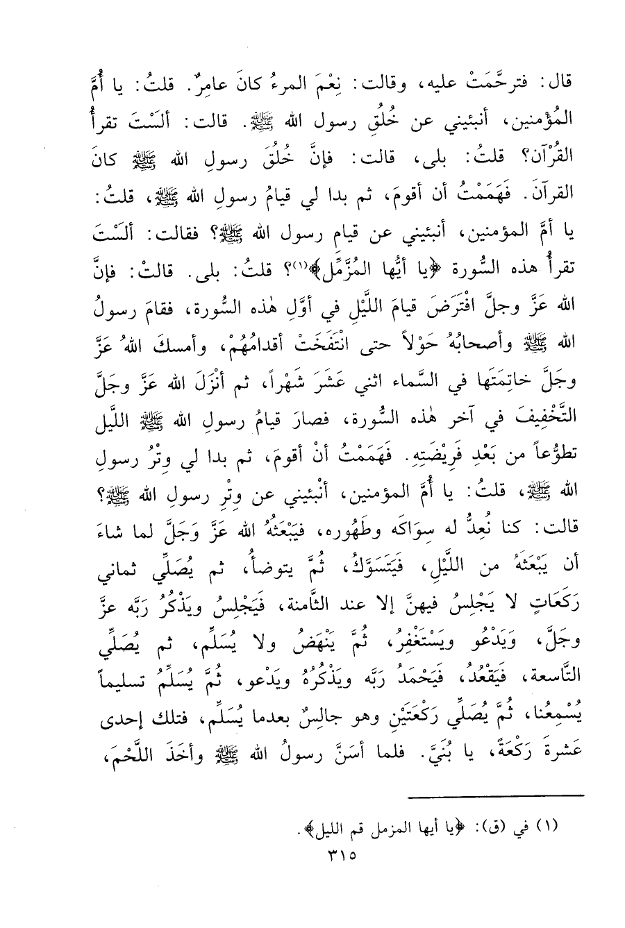 ثُمَّ بَدَا لِي قِيَامُ رَسُولِ اللهِ صَلَّى اللهُ عَلَيْهِ وَسَلَّمَ، قُلْتُ: يَا أُمَّ الْمُؤْمِنِينَ، أَنْبِئِينِي عَنْ قِيَامِ رَسُولِ اللهِ صَلَّى اللهُ عَلَيْهِ وَسَلَّمَ؟ فَقَالَتْ: أَلَسْتَ تَقْرَأُ هَذِهِ السُّورَةَ يَا أَيُّهَا الْمُزَّمِّلُ؟ (١) قُلْتُ: بَلَى، قَالَتْ: " فَإِنَّ اللهَ عَزَّ وَجَلَّ افْتَرَضَ قِيَامَ اللَّيْلِ فِي أَوَّلِ هَذِهِ السُّورَةِ، فَقَامَ رَسُولُ اللهِ صَلَّى اللهُ عَلَيْهِ وَسَلَّمَ وَأَصْحَابُهُ حَوْلًا حَتَّى انْتَفَخَتْ أَقْدَامُهُمْ، وَأَمْسَكَ اللهُ عَزَّ وَجَلَّ خَاتِمَتَهَا فِي السَّمَاءِ اثْنَيْ عَشَرَ شَهْرًا، ثُمَّ أَنْزَلَ اللهُ عَزَّ وَجَلَّ التَّخْفِيفَ فِي آخِرِ هَذِهِ السُّورَةِ، فَصَارَ قِيَامُ رَسُولِ اللهِ صَلَّى اللهُ عَلَيْهِ وَسَلَّمَ تَطَوُّعًا مِنْ بَعْدِ فَرِيضَتِهِ "، فَهَمَمْتُ أَنْ أَقُومَ