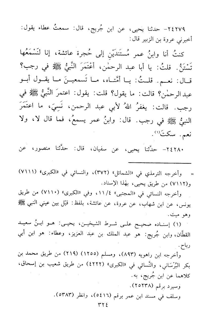 ٢٤٢٧٩ - حَدَّثَنَا يَحْيَى، عَنِ ابْنِ جُرَيْجٍ قَالَ: سَمِعْتُ عَطَاءً يَقُولُ: أَخْبَرَنِي عُرْوَةُ بْنُ الزُّبَيْرِ قَالَ: كُنْتُ أَنَا وابْنُ عُمَرَ، مُسْتَنِدَيْنِ إِلَى حُجْرَةِ عَائِشَةَ، إِنَّا لَنَسْمَعُهَا تَسْتَنُّ قُلْتُ: يَا أَبَا عَبْدِ الرَّحْمَنِ اعْتَمَرَ النَّبِيُّ صَلَّى اللهُ عَلَيْهِ وَسَلَّمَ فِي رَجَبٍ؟ قَالَ: نَعَمْ، قُلْتُ: يَا أُمَّتَاهُ، مَا تَسْمَعِينَ مَا يَقُولُ أَبُو عَبْدِ الرَّحْمَنِ؟ قَالَتْ: مَا يَقُولُ؟ قُلْتُ: يَقُولُ: " اعْتَمَرَ النَّبِيُّ صَلَّى اللهُ عَلَيْهِ وَسَلَّمَ فِي رَجَبٍ "، قَالَتْ: يَغْفِرُ اللهُ لِأَبِي عَبْدِ الرَّحْمَنِ نَسِيَ، " مَا اعْتَمَرَ النَّبِيُّ صَلَّى اللهُ عَلَيْهِ وَسَلَّمَ فِي رَجَبٍ " قَالَ: وَابْنُ عُمَرَ يَسْمَعُ، فَمَا قَالَ لَا، وَلَا نَعَمْ، سَكَتَ (١)