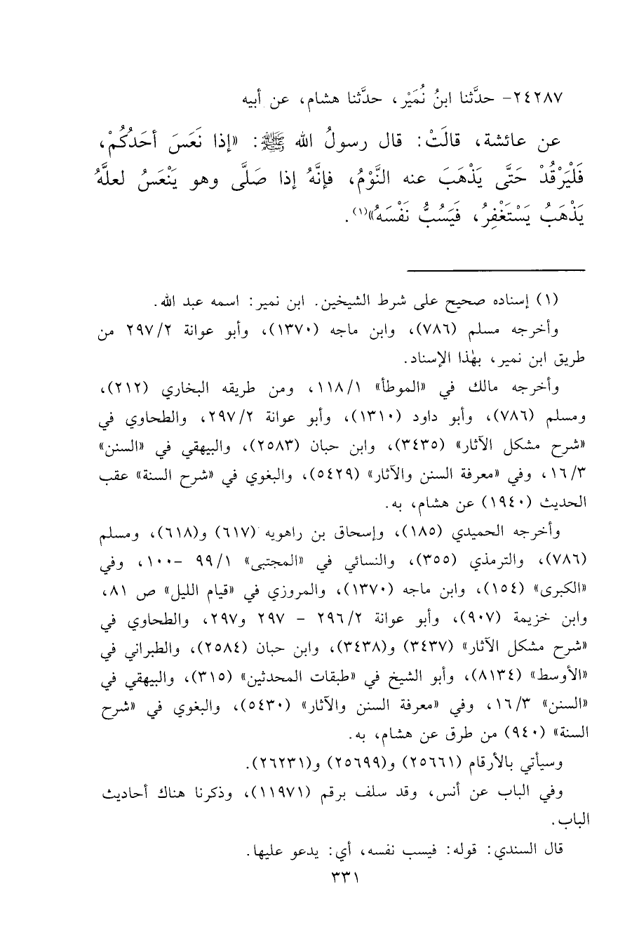 ٢٤٢٨٧ - حَدَّثَنَا ابْنُ نُمَيْرٍ، حَدَّثَنَا هِشَامٌ، عَنْ أَبِيهِ، عَنْ عَائِشَةَ قَالَتْ: قَالَ رَسُولُ اللهِ صَلَّى اللهُ عَلَيْهِ وَسَلَّمَ: " إِذَا نَعَسَ أَحَدُكُمْ فَلْيَرْقُدْ، حَتَّى يَذْهَبَ عَنْهُ النَّوْمُ، فَإِنَّهُ إِذَا صَلَّى وَهُوَ يَنْعَسُ لَعَلَّهُ يَذْهَبُ يَسْتَغْفِرُ، فَيَسُبُّ نَفْسَهُ " (١)