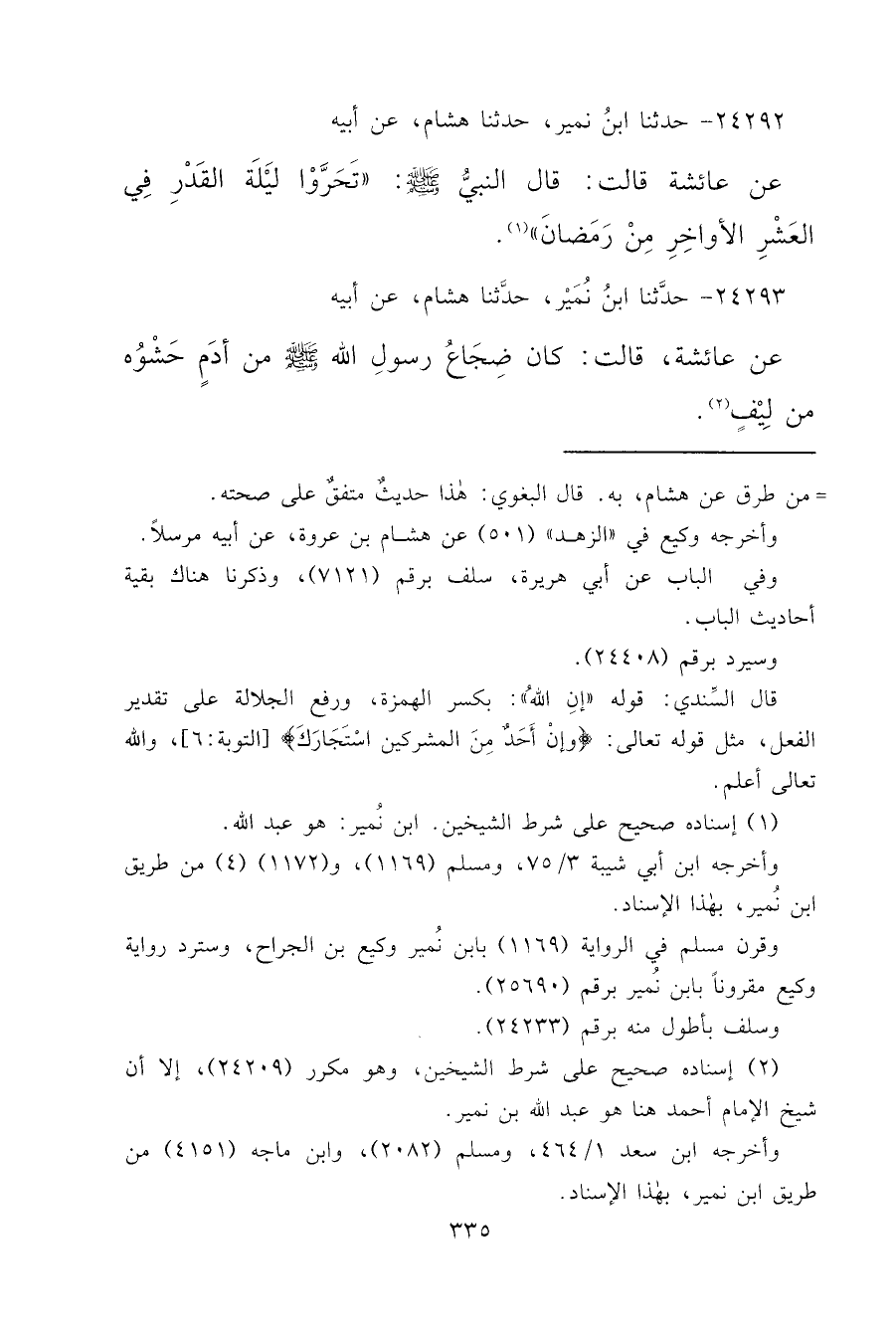 ٢٤٢٩٢ - حَدَّثَنَا ابْنُ نُمَيْرٍ، حَدَّثَنَا هِشَامٌ، عَنْ أَبِيهِ، عَنْ عَائِشَةَ قَالَتْ: قَالَ النَّبِيُّ صَلَّى اللهُ عَلَيْهِ وَسَلَّمَ: " تَحَرَّوْا لَيْلَةَ الْقَدْرِ فِي الْعَشْرِ الْأَوَاخِرِ مِنْ رَمَضَانَ " (١)