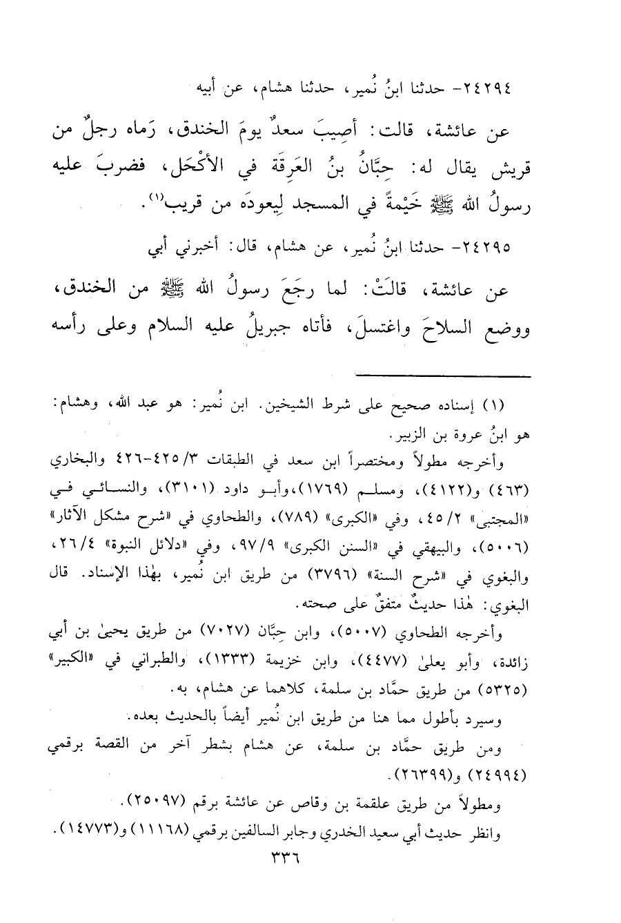 ٢٤٢٩٤ - حَدَّثَنَا ابْنُ نُمَيْرٍ، حَدَّثَنَا هِشَامٌ، عَنْ أَبِيهِ، عَنْ عَائِشَةَ قَالَتْ: " أُصِيبَ سَعْدٌ يَوْمَ الْخَنْدَقِ، رَمَاهُ رَجُلٌ مِنْ قُرَيْشٍ يُقَالُ لَهُ: حِبَّانُ بْنُ الْعَرِقَةِ فِي الْأَكْحَلِ، فَضَرَبَ عَلَيْهِ رَسُولُ اللهِ صَلَّى اللهُ عَلَيْهِ وَسَلَّمَ خَيْمَةً فِي الْمَسْجِدِ لِيَعُودَهُ مِنْ قَرِيبٍ " (١)