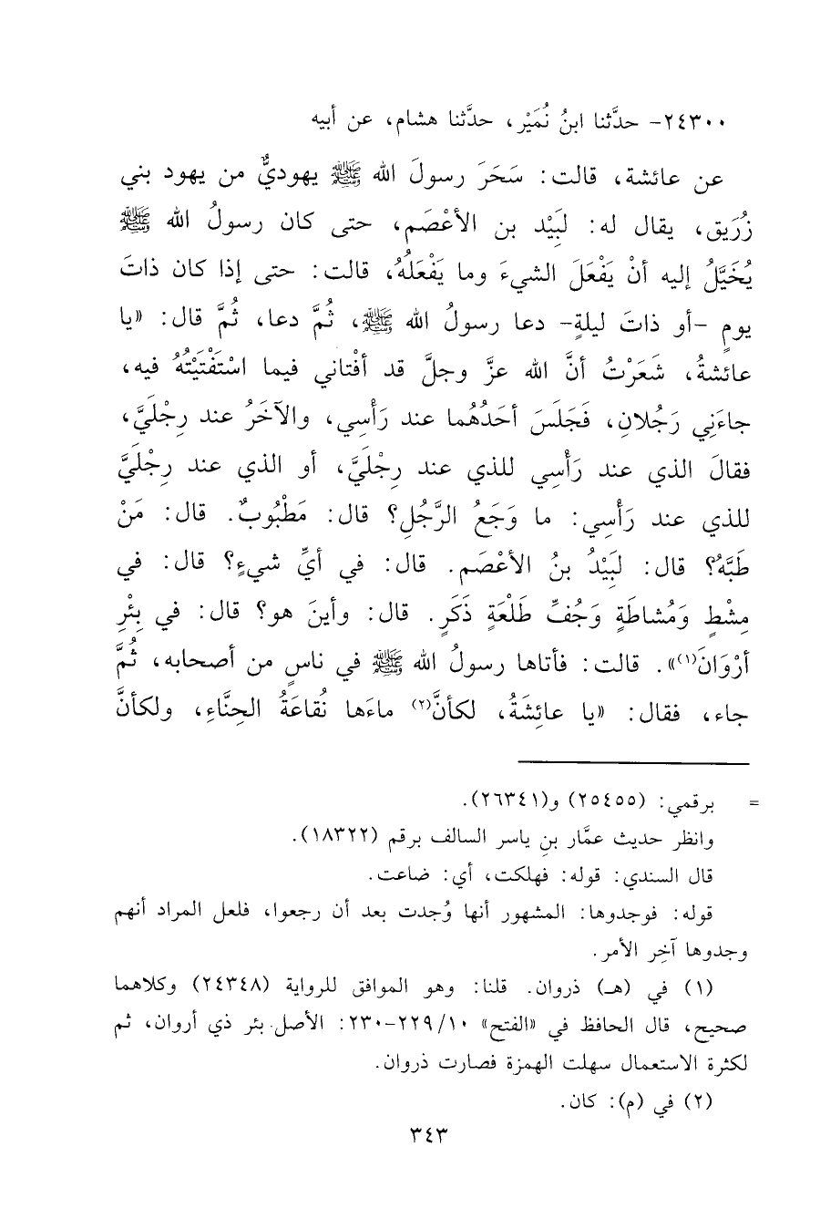 ٢٤٣٠٠ - حَدَّثَنَا ابْنُ نُمَيْرٍ، حَدَّثَنَا هِشَامٌ، عَنْ أَبِيهِ، عَنْ عَائِشَةَ قَالَتْ: سَحَرَ رَسُولَ اللهِ صَلَّى اللهُ عَلَيْهِ وَسَلَّمَ يَهُودِيٌّ مِنْ يَهُودِ بَنِي زُرَيْقٍ يُقَالُ لَهُ: لَبِيدُ بْنُ الْأَعْصَمِ حَتَّى كَانَ رَسُولُ اللهِ صَلَّى اللهُ عَلَيْهِ وَسَلَّمَ يُخَيَّلُ إِلَيْهِ أَنْ يَفْعَلَ الشَّيْءَ وَمَا يَفْعَلُهُ، قَالَتْ: حَتَّى إِذَا كَانَ ذَاتَ يَوْمٍ أَوْ ذَاتَ لَيْلَةٍ دَعَا رَسُولُ اللهِ صَلَّى اللهُ عَلَيْهِ وَسَلَّمَ، ثُمَّ دَعَا، ثُمَّ قَالَ: " يَا عَائِشَةُ شَعَرْتُ أَنَّ اللهَ عَزَّ وَجَلَّ قَدْ أَفْتَانِي فِيمَا اسْتَفْتَيْتُهُ فِيهِ، جَاءَنِي رَجُلَانِ، فَجَلَسَ أَحَدُهُمَا عِنْدَ رَأْسِي، وَالْآخَرُ عِنْدَ رِجْلَيَّ، فَقَالَ الَّذِي عِنْدَ رَأْسِي لِلَّذِي عِنْدَ رِجْلَيَّ، أَوِ الَّذِي عِنْدَ رِجْلَيَّ لِلَّذِي عِنْدَ رَأْسِي،: مَا وَجَعُ الرَّجُلِ؟ قَالَ: مَطْبُوبٌ، قَالَ: مَنْ طَبَّهُ؟ قَالَ: لَبِيدُ بْنُ الْأَعْصَمِ، قَالَ: فِي أَيِّ شَيْءٍ؟ قَالَ: فِي مُشْطٍ وَمُشَاطَةٍ، وَجُفِّ طَلْعَةِ ذَكَرٍ، قَالَ: وَأَيْنَ هُوَ؟ قَالَ: فِي بِئْرِ أَرْوَانَ (١) " قَالَتْ: فَأَتَاهَا رَسُولُ اللهِ صَلَّى اللهُ عَلَيْهِ وَسَلَّمَ فِي نَاسٍ مِنْ أَصْحَابِهِ، ثُمَّ جَاءَ فَقَالَ: " يَا عَائِشَةُ لَكَأَنَّ (٢) مَاءَهَا نُقَاعَةُ الْحِنَّاءِ، وَلَكَأَنَّ