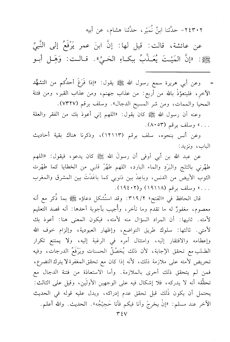 قال الحافظ في "الفتح" ٢/٣١٩: وقد استُشكل دعاؤه صَلَّى اللهُ عَلَيْهِ وَسَلَّمَ بما ذُكر مع أنه معصوم، مغفورٌ له ما تقدم وما تأخر، وأجيب بأجوبة أحدها: أنه قصد التعليم لأمته. ثانيها: أن المراد السؤال منه لأمته، فيكون المعنى هنا: أعوذ بك لأمتي. ثالثها: سلوك طريق التواضع، وإظهار العبودية، وإلزام خوف الله وإعظامه والافتقار إليه، وامتثال أمره في الرغبة إليه، ولا يمتنع تكرار الطلب مع تحقق الإجابة، لأن ذلك يُحَصِّلُ الحسنات: ويَرْفَعُ الدرجات، وفيه تحريض لأمته على ملازمة ذلك، لأنه إذا كان مع تحقق المغفرة لا يترك التضرع، فمن لم يتحقق ذلك أحدكما بالملازمة. وأما الاستعاذة من فتنة الدجالة مع تحقُّقه أنه لا يدركه، فلا إشكالا فيه على الوجهين الأولَين، وقيل على الثالث: يحتمل أن يكون ذلك قبل تحقق عدم إدراكه، ويدل عليه قوله في الحديث الآخر عند مسلم: "إنْ يخرج وأنا فيكم فأنا حجِيْجه". الحديث. والله أعلم.