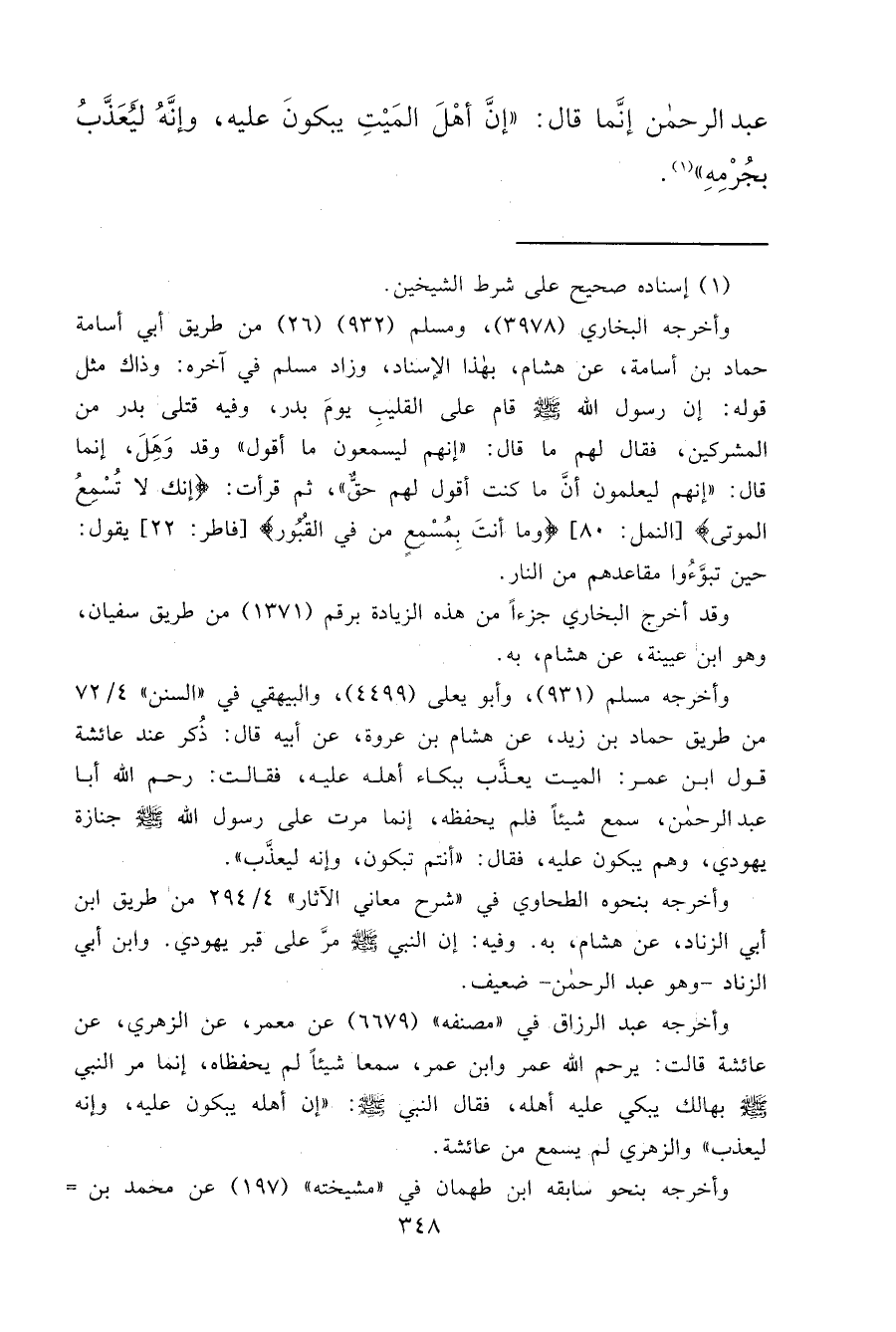 عَبْدِ الرَّحْمَنِ إِنَّمَا قَالَ: " إِنَّ أَهْلَ الْمَيِّتِ يَبْكُونَ عَلَيْهِ، وَإِنَّهُ لَيُعَذَّبُ بِجُرْمِهِ " (١)