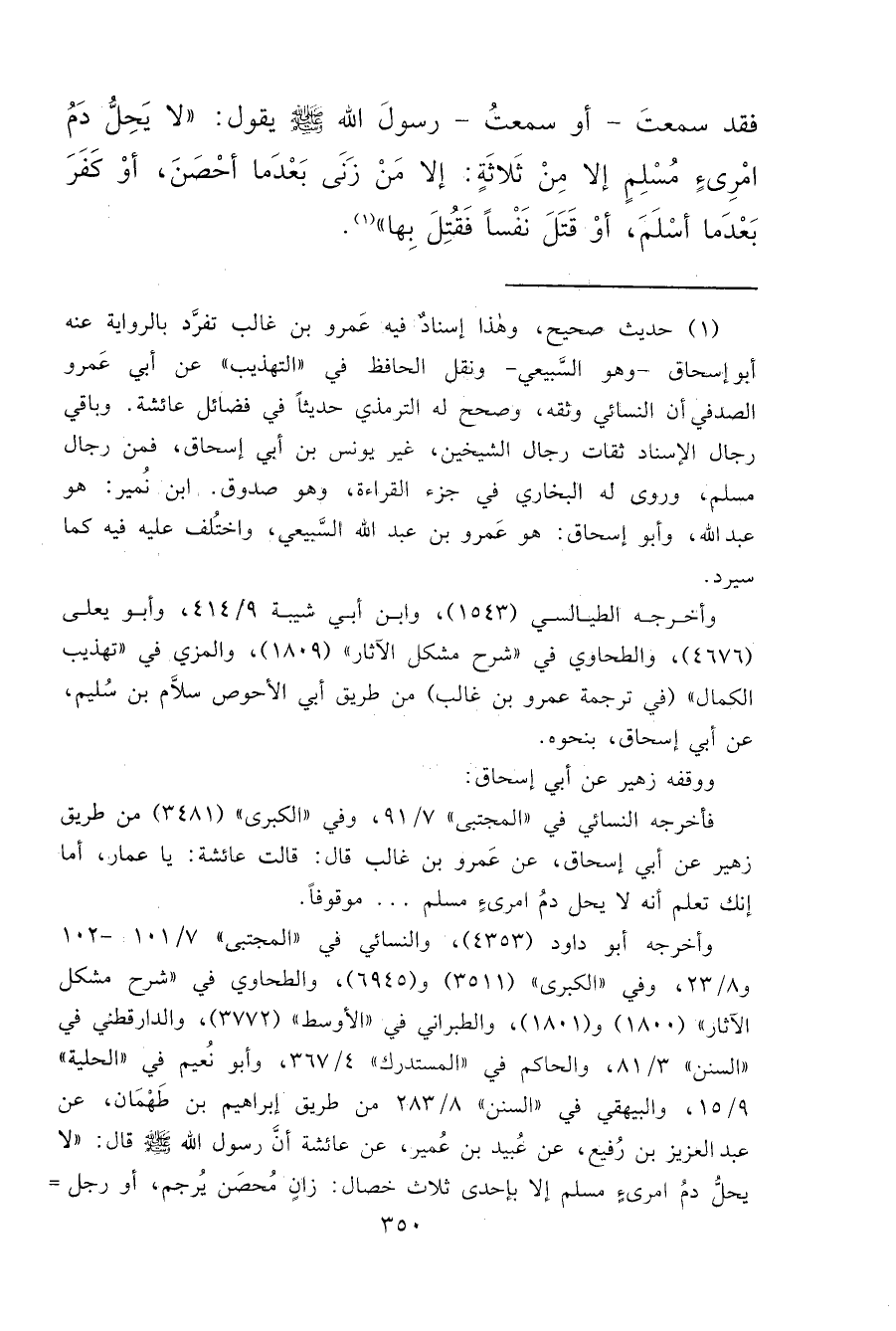 فَقَدْ سَمِعْتَ أَوْ سَمِعْتُ رَسُولَ اللهِ صَلَّى اللهُ عَلَيْهِ وَسَلَّمَ يَقُولُ: " لَا يَحِلُّ دَمُ امْرِئٍ مُسْلِمٍ إِلَّا مِنْ ثَلَاثَةٍ: إِلَّا مَنْ زَنَى بَعْدَمَا أُحْصِنَ، أَوْ كَفَرَ بَعْدَمَا أَسْلَمَ، أَوْ قَتَلَ نَفْسًا فَقُتِلَ بِهَا " (١)
