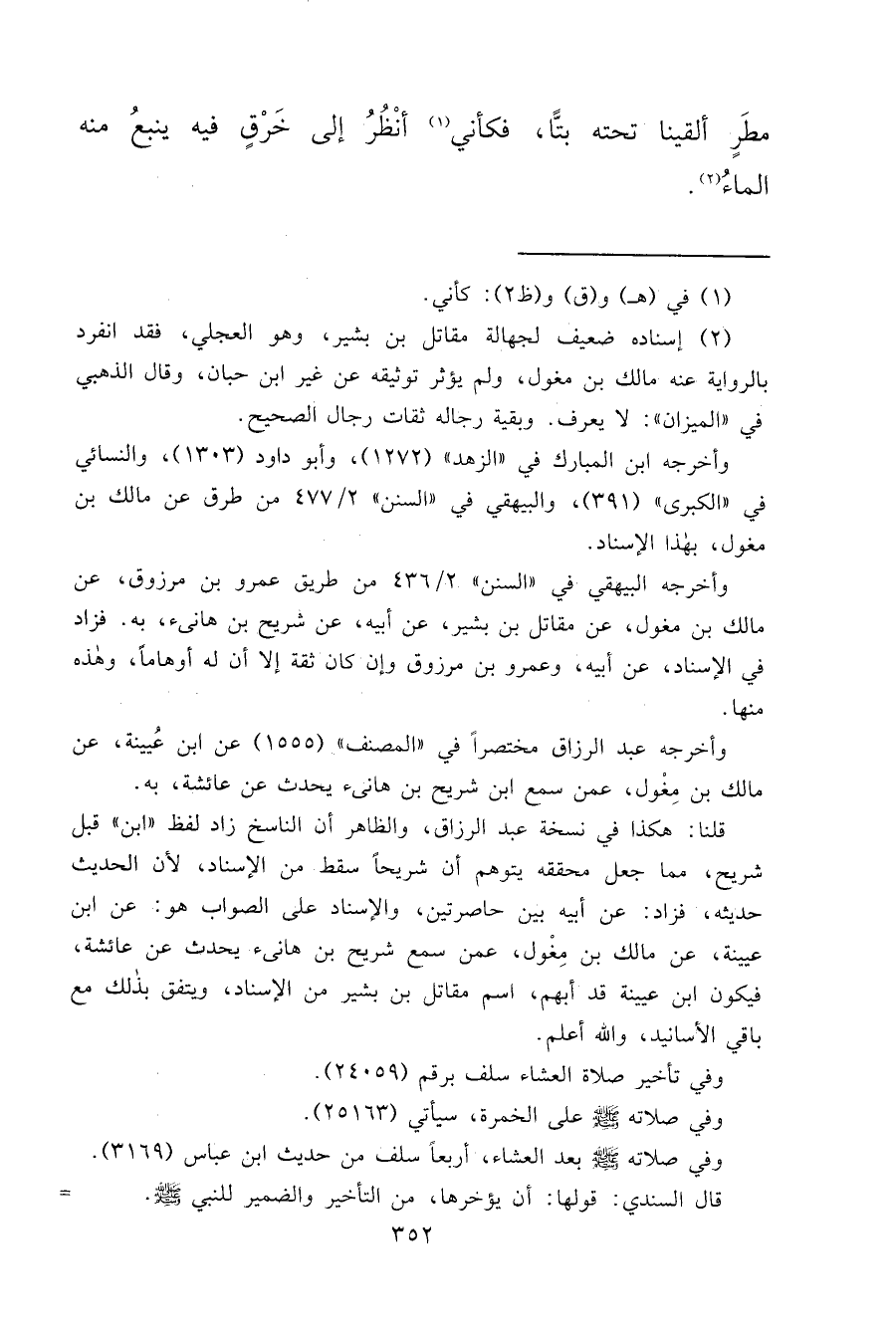 قلنا: هكذا في نسخة عبد الرزاق، والظاهر أن الناسخ زاد لفظ "ابن" قبل شريح، مما جعل محققَه يتوهم أن شريحاً سقط من الإسناد، لأن الحديث حديثه، فزاد: عن أبيه بين حاصرتين، والإسناد على الصواب هو: عن ابن عيينه، عن مالك بن مِغْول، عمن سمع شريح بن هانئ يحدث عن عائشة،
